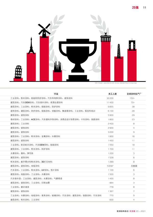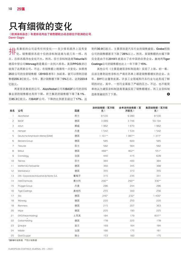 摘要:《歐洲涂料雜志》年度排名列出了銷售額前25名總部位于歐洲的公司