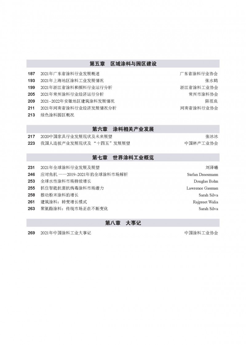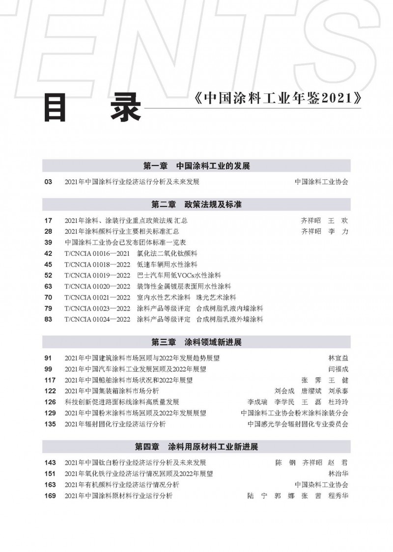 《中國(guó)涂料工業(yè)年鑒2021》共分7個(gè)章節(jié),總結(jié)了2021年中國(guó)涂料工業(yè)經(jīng)濟(jì)運(yùn)行現(xiàn)狀,收錄了2021年度與涂料和顏料行業(yè)相關(guān)的政策法規(guī)及標(biāo)準(zhǔn),闡述了我國(guó)涂料細(xì)分領(lǐng)域2021年度經(jīng)濟(jì)運(yùn)行、市場(chǎng)狀況、技術(shù)新進(jìn)展及未來發(fā)展,整理了國(guó)內(nèi)主要地區(qū)的涂料工業(yè)運(yùn)行及園區(qū)建設(shè)現(xiàn)狀,以及全球不同涂料領(lǐng)域市場(chǎng)發(fā)展?fàn)顩r,總結(jié)了我國(guó)主要涂料用原材料工業(yè)的新進(jìn)展和市場(chǎng)走勢(shì),記錄了2021年我國(guó)涂料行業(yè)經(jīng)歷的重要事件等。