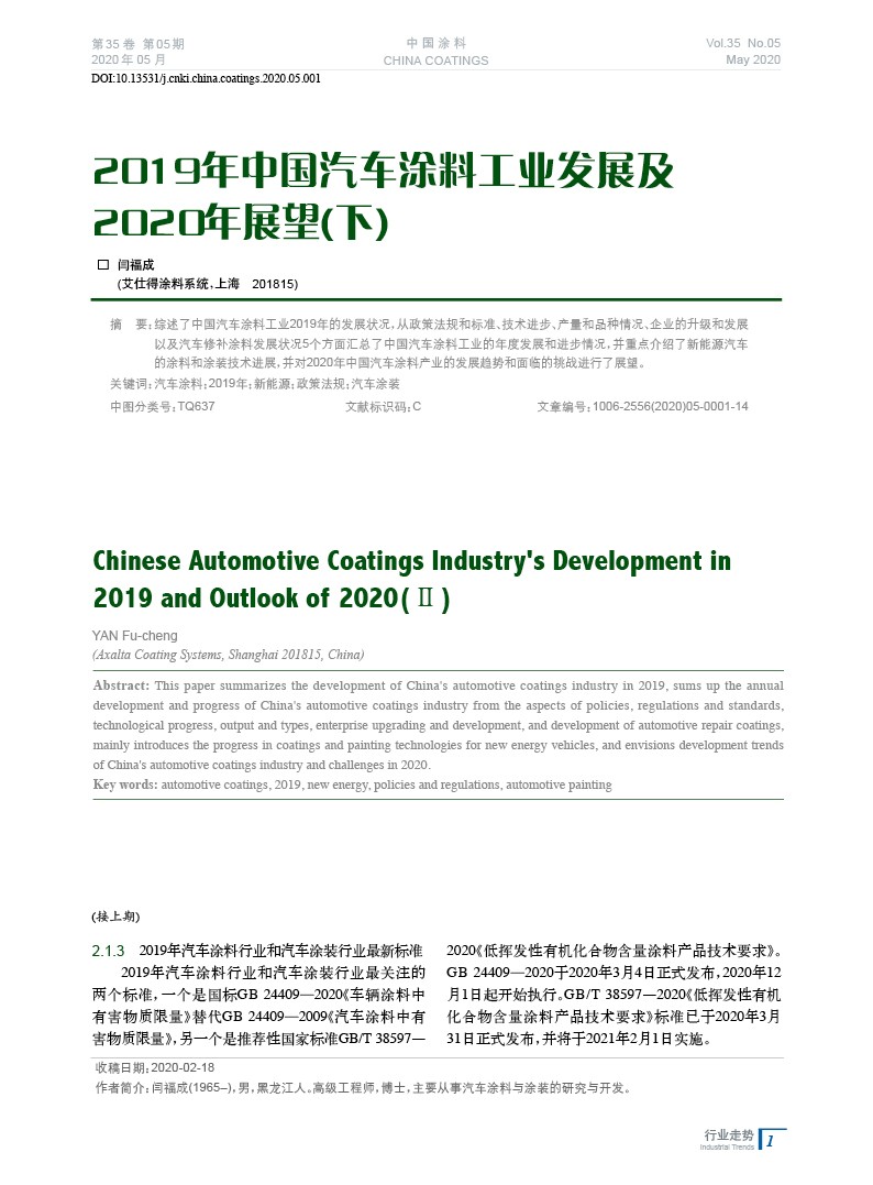 摘要:綜述了中國(guó)汽車(chē)涂料工業(yè)2019年的發(fā)展?fàn)顩r,從政策法規(guī)和標(biāo)準(zhǔn)、技術(shù)進(jìn)步、產(chǎn)量和品種情況、企業(yè)的升級(jí)和發(fā)展以及汽車(chē)修補(bǔ)涂料發(fā)展?fàn)顩r5個(gè)方面匯總了中國(guó)汽車(chē)涂料工業(yè)的年度發(fā)展和進(jìn)步情況,并重點(diǎn)介紹了新能源汽車(chē)的涂料和涂裝技術(shù)進(jìn)展,并對(duì)2020年中國(guó)汽車(chē)涂料產(chǎn)業(yè)的發(fā)展趨勢(shì)和面臨的挑戰(zhàn)進(jìn)行了展望。