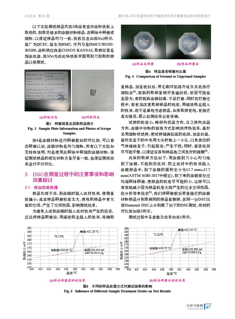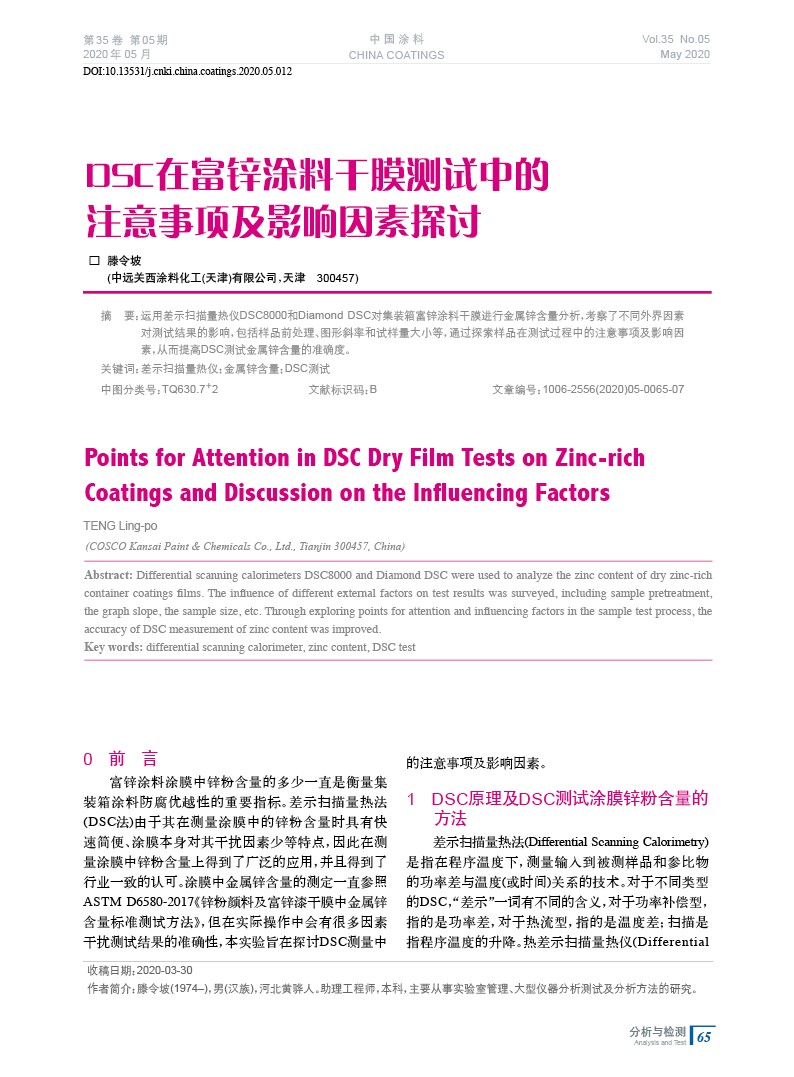 運用差示掃描量熱儀DSC8000和Diamond DSC對集裝箱富鋅涂料干膜進行金屬鋅含量分析,考察了不同外界因素對測試結果的影響,包括樣品前處理、圖形斜率和試樣量大小等,通過探索樣品在測試過程中的注意事項及影響因素,從而提高DSC測試金屬鋅含量的準確度。