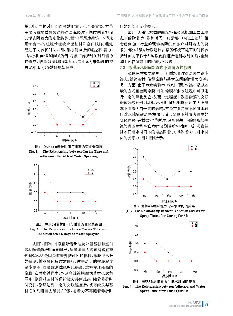 摘要:以自制的水性醇酸涂料為涂層,金屬機(jī)加工面為基材,討論了基材處理劑、養(yǎng)護(hù)時(shí)間、淋水時(shí)間對(duì)涂層在金屬加工面上濕態(tài)下附著力的影響。采用濃度為3%的硅烷處理液處理基材能夠有效地提高涂層在金屬加工面上的附著力;隨著養(yǎng)護(hù)時(shí)間和淋水時(shí)間的延長(zhǎng),能夠在一定程度上改善水性醇酸涂料在金屬加工面上的濕態(tài)附著力較差的現(xiàn)象。