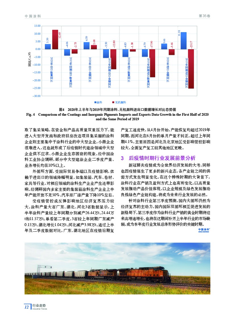 綜述了在新冠肺炎疫情影響下,我國涂料行業2020年上半年與2019年同期數據的對比分析,從產量、主營業務收入、利潤、進出口等方面總結了2020年上半年涂料行業發展形勢,介紹了后疫情時期涂料行業重點領域發展概況,并對未來行業發展進行了展望。