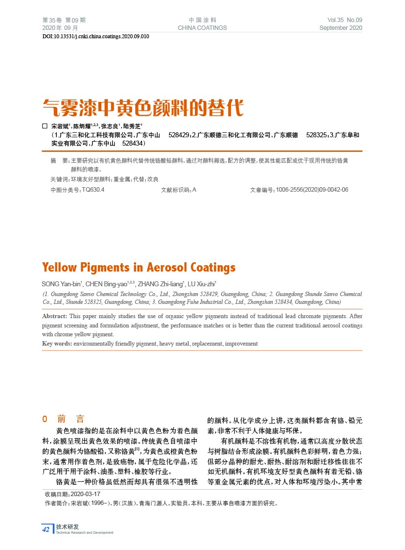 摘要:主要研究以有機(jī)黃色顏料代替?zhèn)鹘y(tǒng)鉻酸鉛顏料,通過對(duì)顏料篩選,配方的調(diào)整,使其性能匹配或優(yōu)于現(xiàn)用傳統(tǒng)的鉻黃顏料的噴漆。