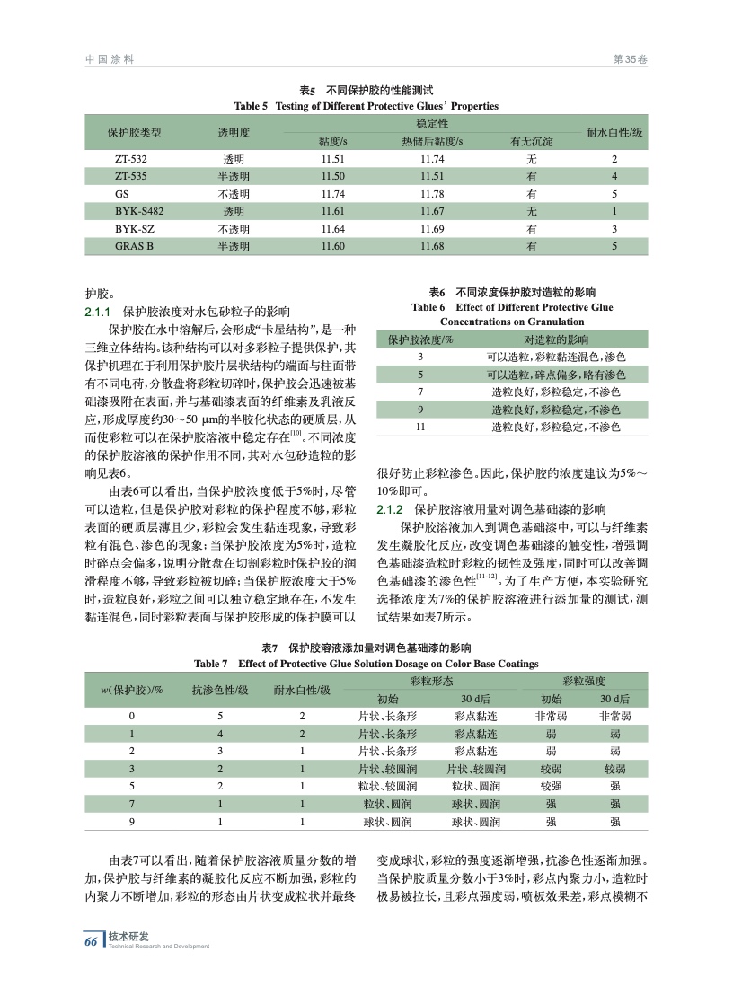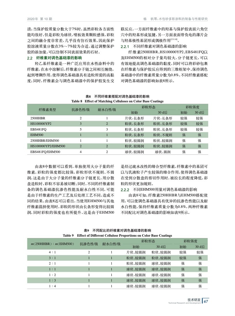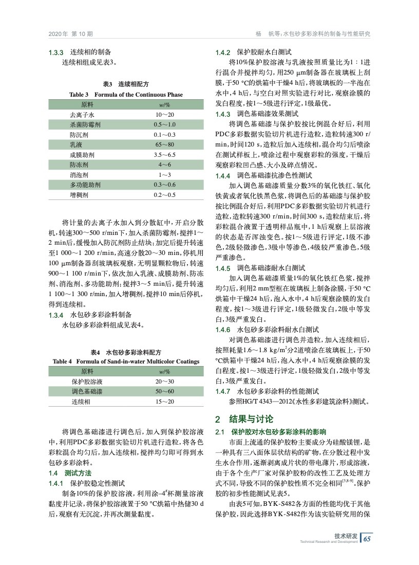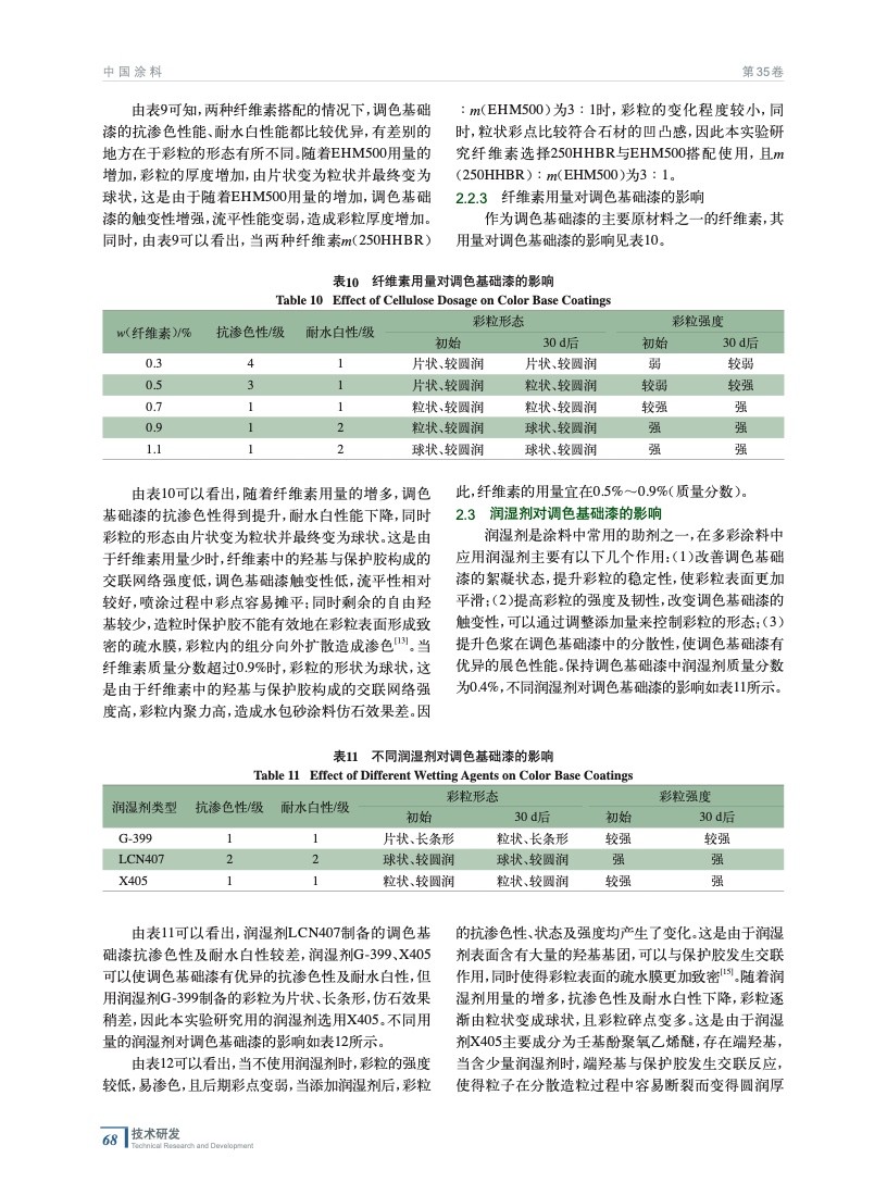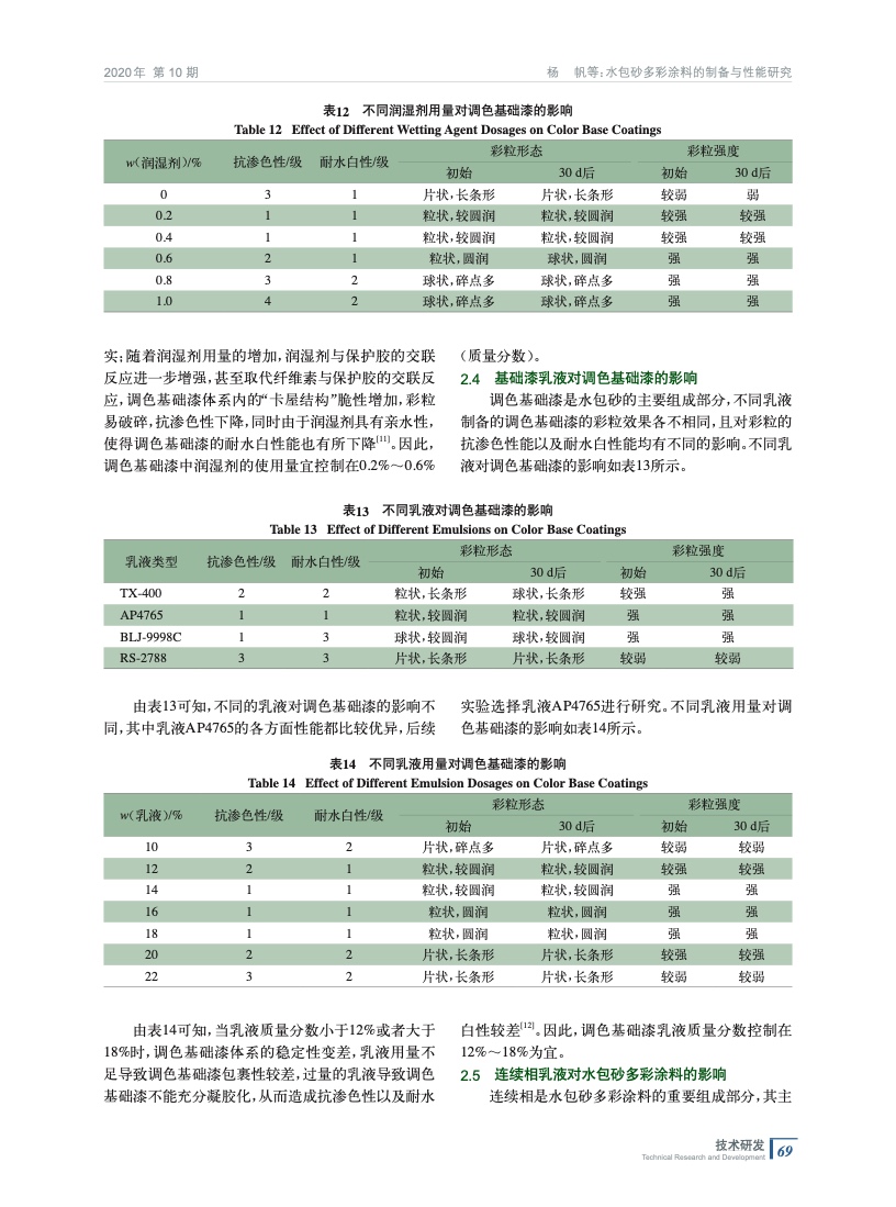 從保護膠、纖維素、潤濕劑以及乳液入手,通過篩選不同的原材料以及對原材料用量的調整,制備得到了一種仿石效果逼真,抗滲色性、耐水白性優異,并且黏度穩定的水包砂多彩涂料。