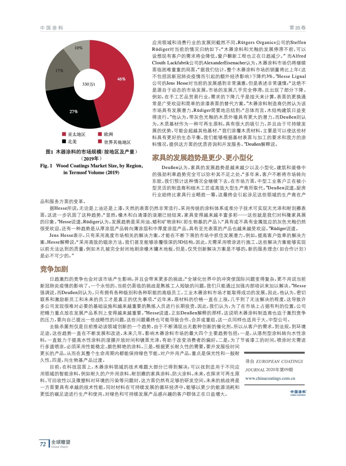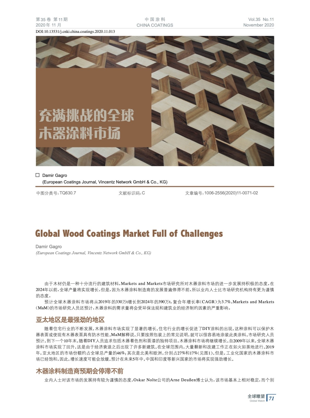 摘要:編者按:預(yù)計全球木器涂料市場將從2019年的330萬t增長到2024年的390萬t,復(fù)合年增長率(CAGR)為3.7%。Markets and Markets(MaM)的市場研究人員還預(yù)計,木器涂料的需求量將會受環(huán)保法規(guī)和建筑業(yè)的經(jīng)濟(jì)制約因素的嚴(yán)重影響。