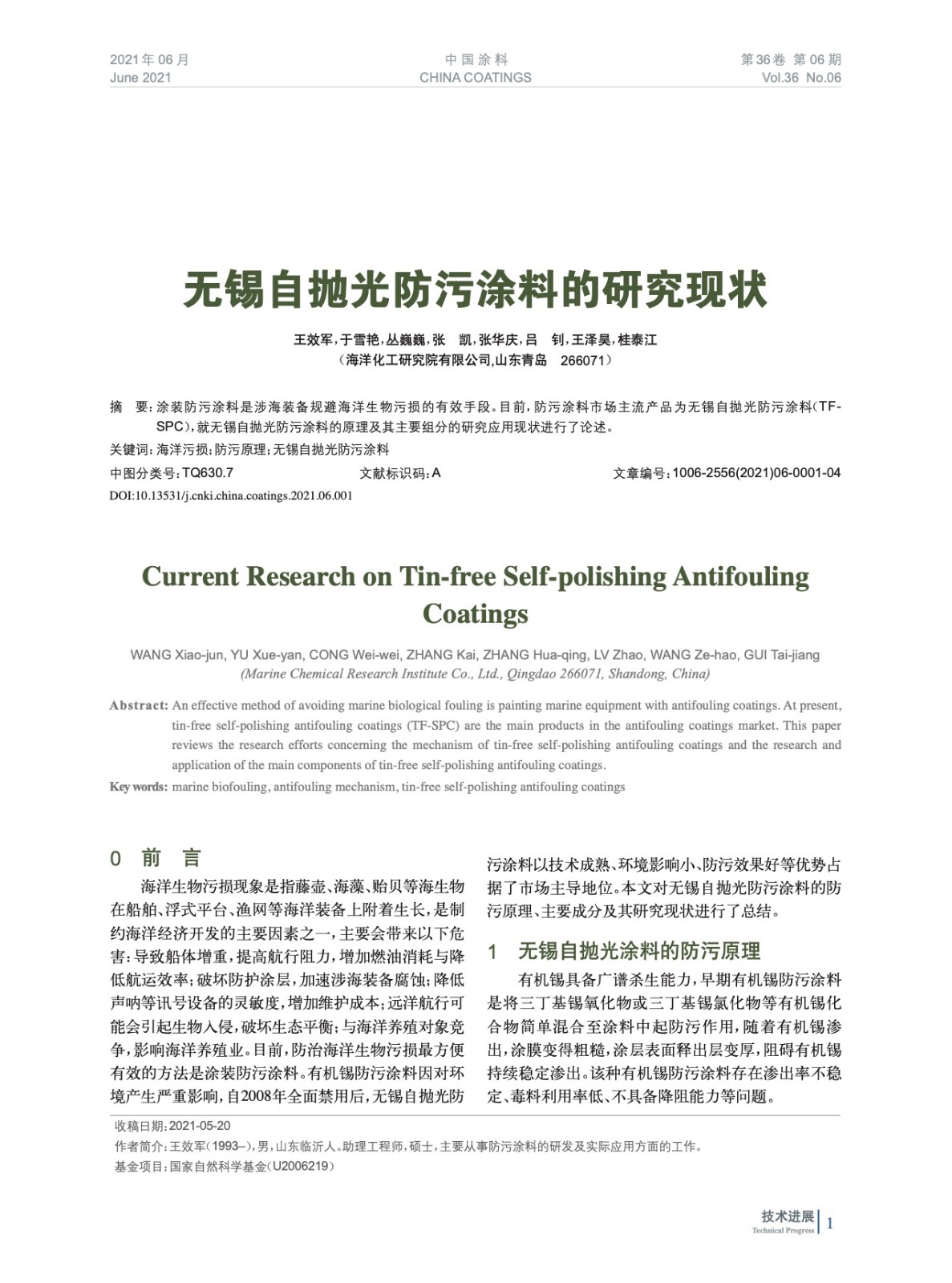 涂裝防污涂料是涉海裝備規避海洋生物污損的有效手段。目前,防污涂料市場主流產品為無錫自拋光防污涂料(TFSPC),就無錫自拋光防污涂料的原理及其主要組分的研究應用現狀進行了論述。