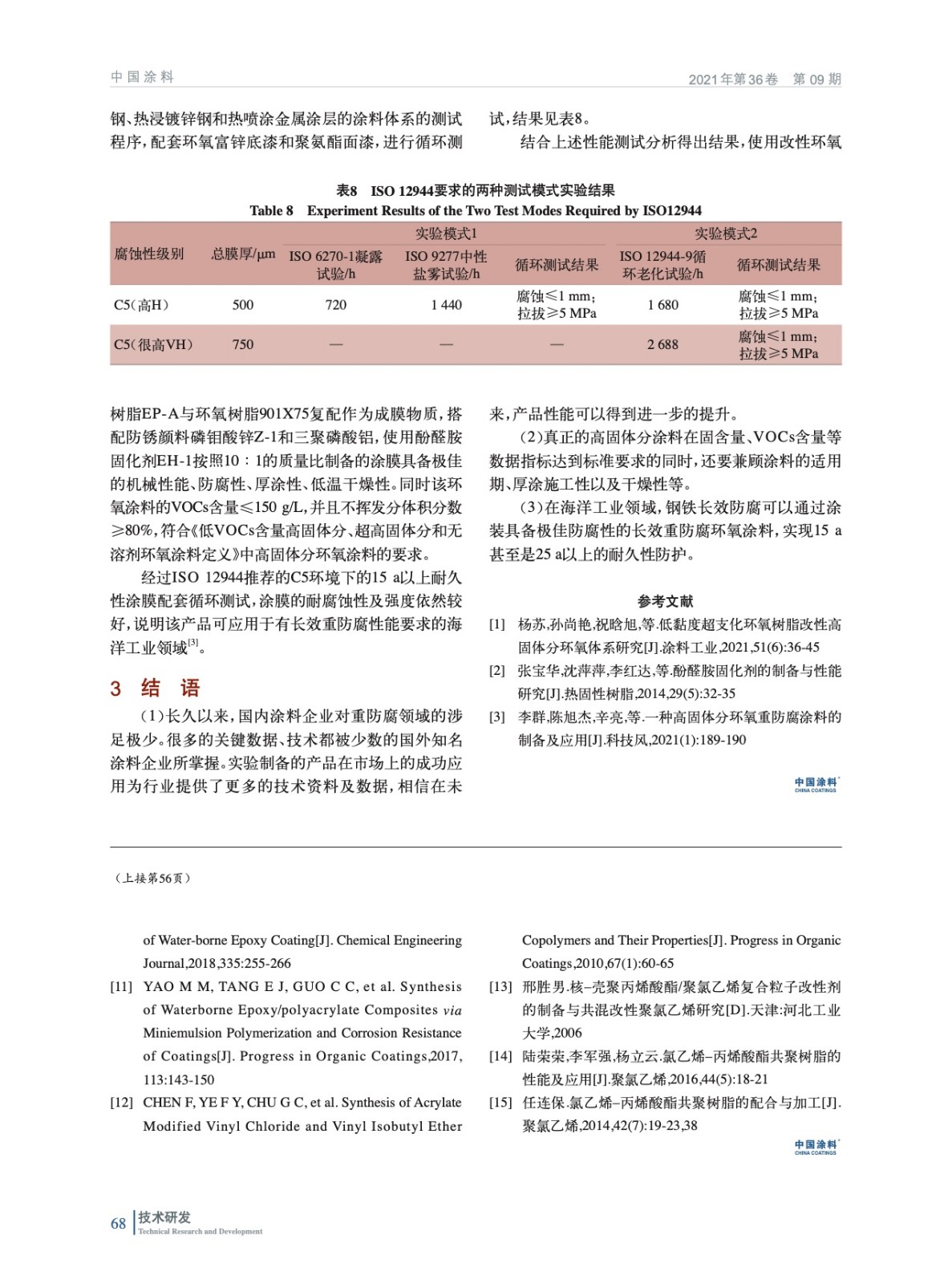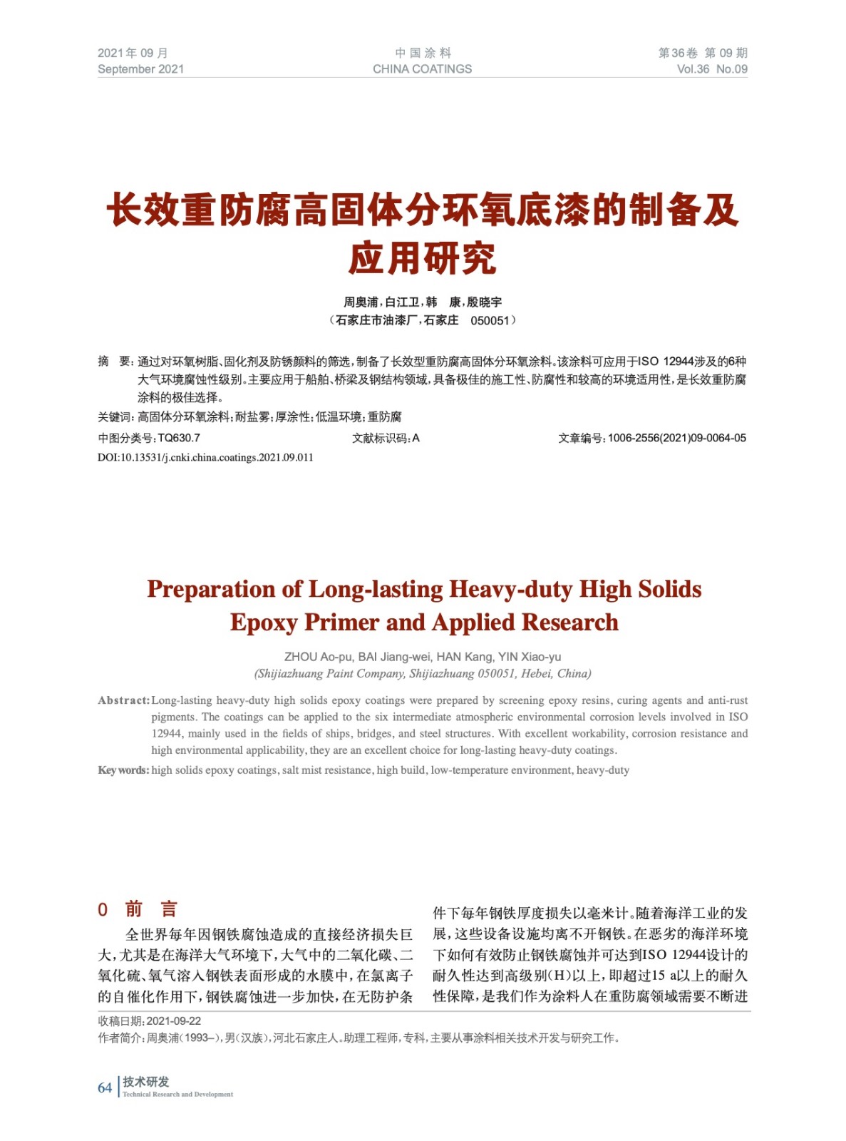 摘要:通過對環氧樹脂、固化劑及防銹顏料的篩選,制備了長效型重防腐高固體分環氧涂料。該涂料可應用于ISO 12944涉及的6種大氣環境腐蝕性級別。主要應用于船舶、橋梁及鋼結構領域,具備極佳的施工性、防腐性和較高的環境適用性,是長效重防腐涂料的極佳選擇。