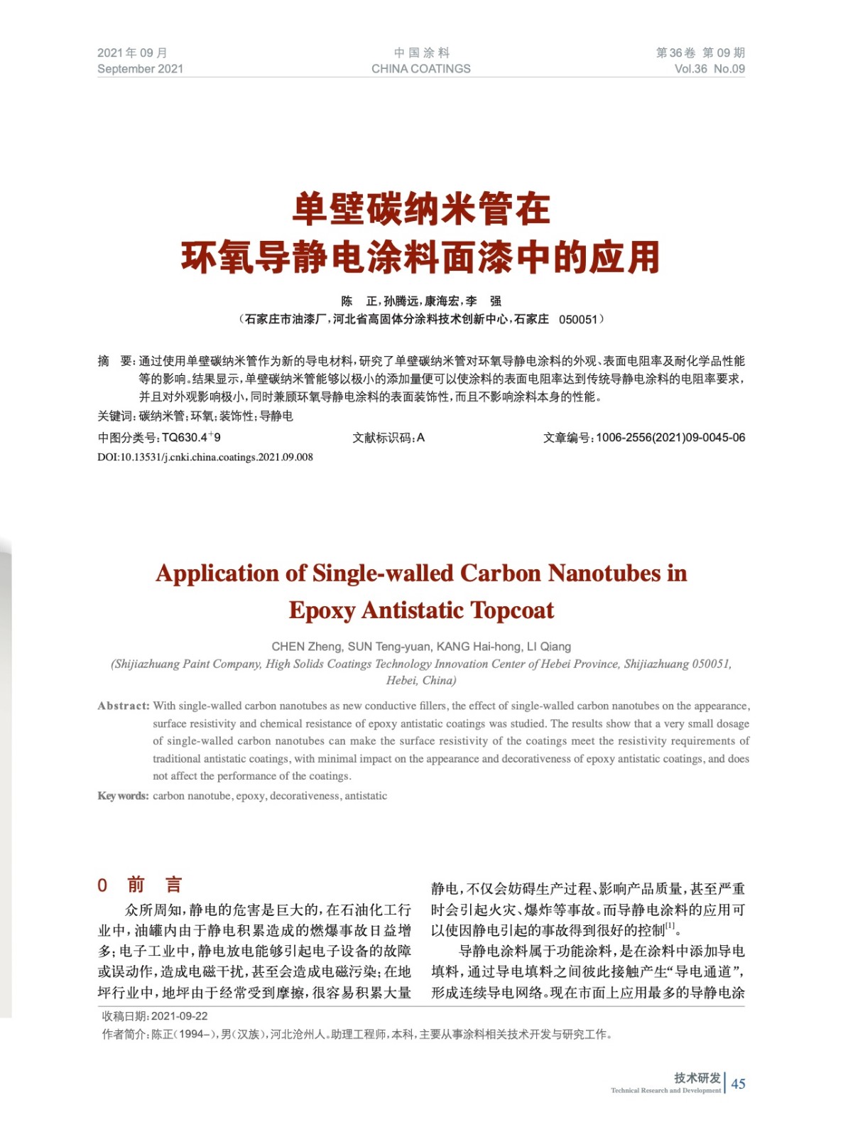 單壁碳納米管在環(huán)氧導(dǎo)靜電涂料面漆中的應(yīng)用