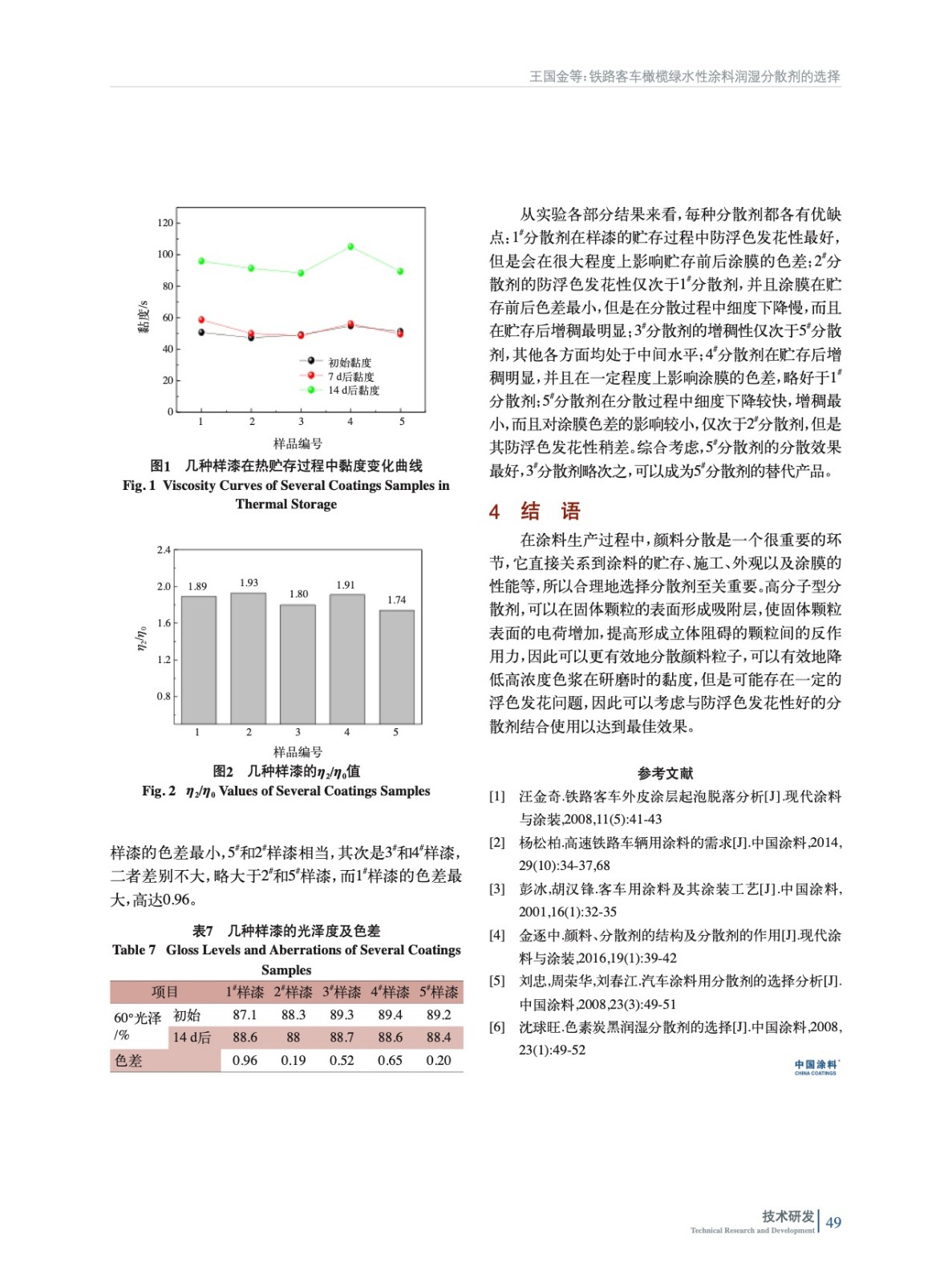 摘要:為了進一步提高鐵路客車用橄欖綠水性涂料在生產過程中的分散效率,對比了5種不同的分散劑對潤濕分散效果、光澤、色差、防浮色發花性以及貯存穩定性的影響,并從理論上解釋了分散劑效果不同的原因。結果表明,使用可控自由基技術聚合的高分子量潤濕分散劑對橄欖綠水性涂料的研磨效率較高,細度下降快,并且成品的光澤較高,貯存穩定性較好,防浮色發花性較好,在潤濕分散方面取得了良好的效果。