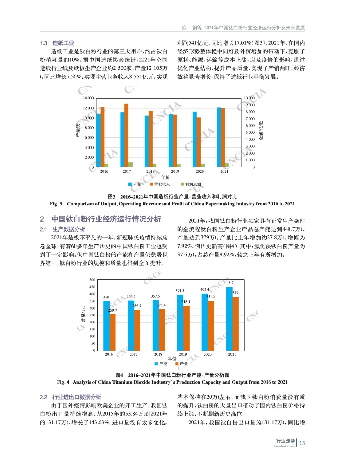 摘要:簡析了鈦白粉行業重點下游行業——涂料、塑料、造紙行業運行情況,分析了2021年中國鈦白粉行業生產、進出口數據,總結了行業運行特點,指出了目前中國鈦白粉行業面臨的問題,指明了行業發展趨勢,并提出有利于我國鈦白粉行業健康發展的相關政策建議。