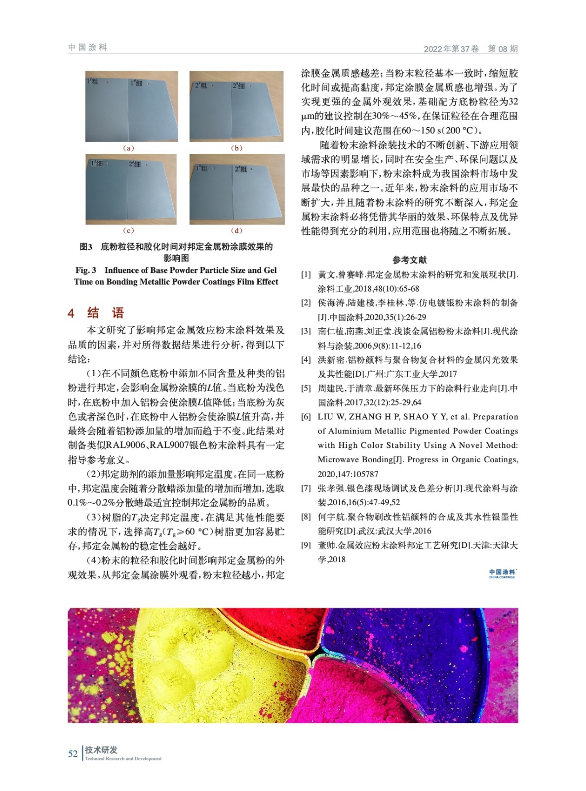 摘要:通過研究鋁粉、邦定助劑、樹脂的Tg以及粉末粒徑和粉末膠化時間等因素對邦定金屬粉品質的影響。得出不同顏色粉末中添加鋁粉后L值的變化情況;邦定助劑的添加量影響邦定溫度的變化;樹脂的Tg影響最終的邦定溫度;粉末粒徑越小,邦定涂膜金屬質感越差,當底粉粒徑基本一致時,縮短膠化時間或提高樹脂黏度,邦定涂膜金屬質感相應增強。