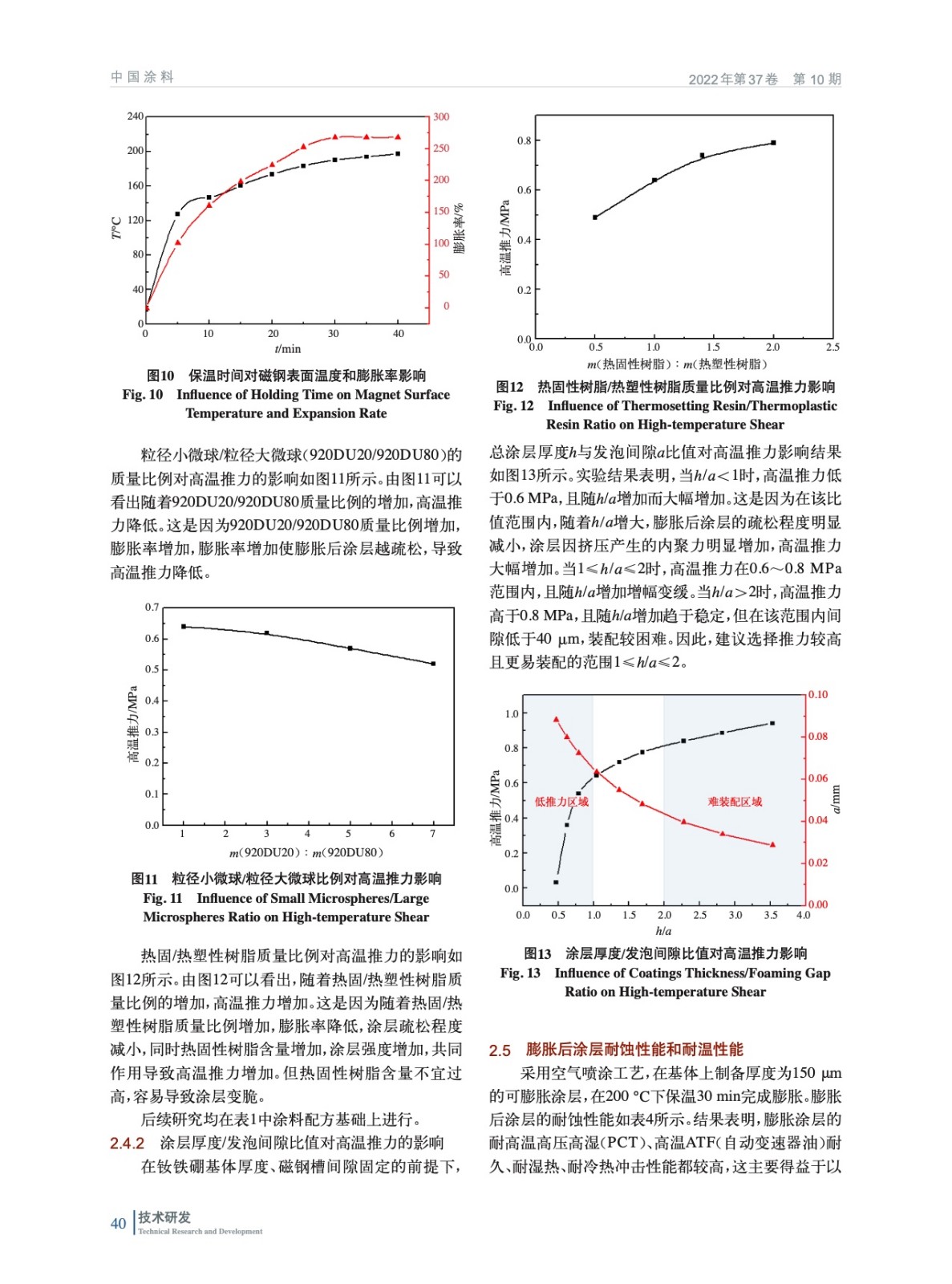 摘要:開發了一種膨脹型涂料,將其噴涂于釹鐵硼基體表面制得涂覆可膨脹涂層的磁鋼,在一定條件下加熱膨脹。經測試表明,當涂層為150 μm,膨脹條件為200 ℃保溫30 min時,自由膨脹率高達258%,且當涂層厚度/發泡間隙比為1~2時,高溫推力在0.6~0.8 MPa范圍內,膨脹后涂層具有良好的耐蝕性和耐溫性。