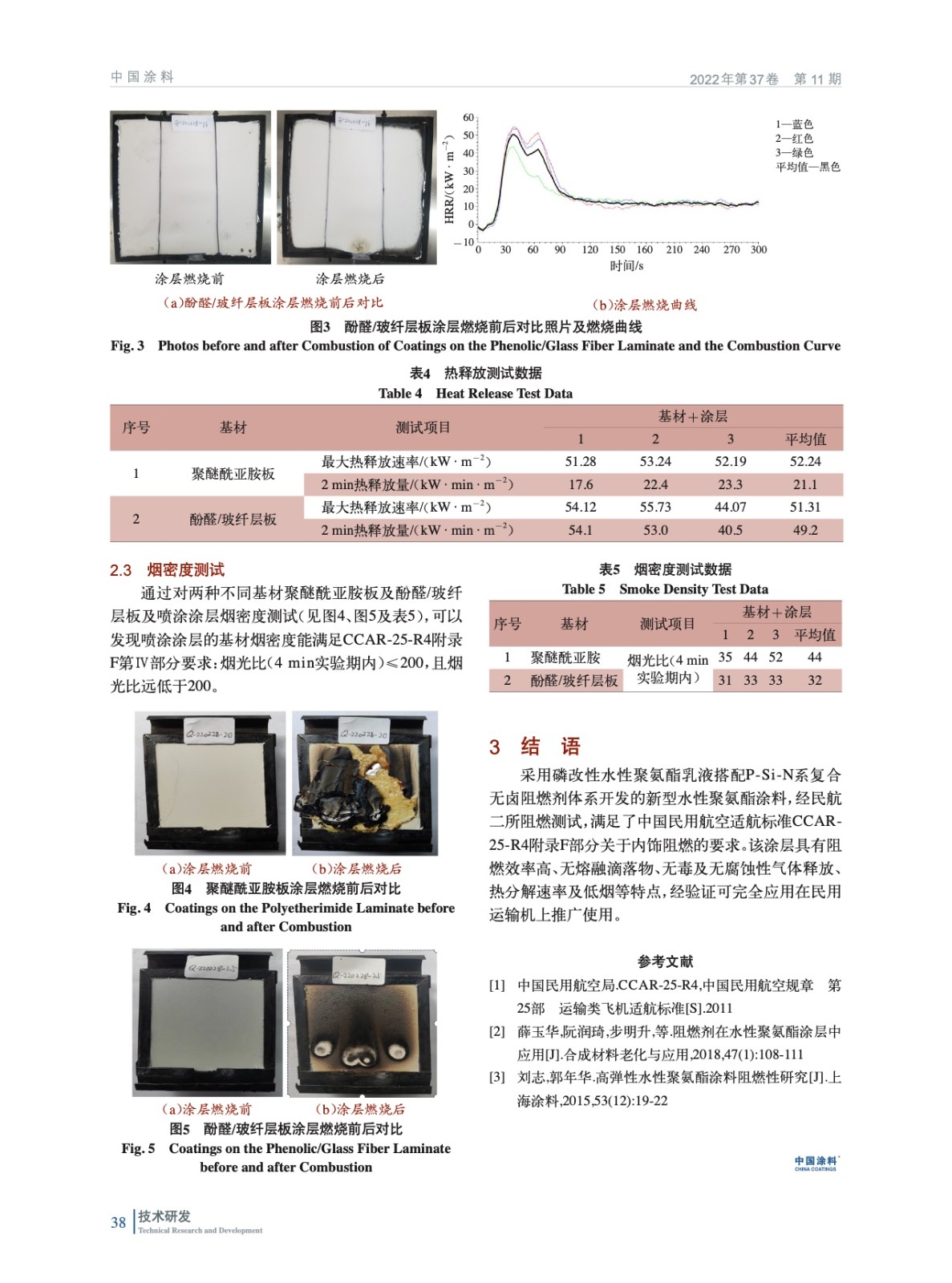 摘要:針對飛機內飾對水性聚氨酯涂層高阻燃要求,采用磷改性水性聚氨酯乳液搭配P-Si-N(磷–硅–氮)系復合無鹵阻燃劑體系開發了新型高阻燃水性聚氨酯涂層,涂覆在聚碳酸酯板、聚醚酰亞胺及酚醛/玻纖層板3種基材上,與空白板進行燃燒對比實驗,測試結果達到了《中國民用航空規章 第25部 運輸類飛機適航標準》[CCAR-25-R4]附錄F部分關于內飾阻燃的要求,涂層具有阻燃效率高、無熔融滴落物、無毒及無腐蝕性氣體釋放、低煙等特點,經驗證可完全應用在航空內飾上推廣使用。