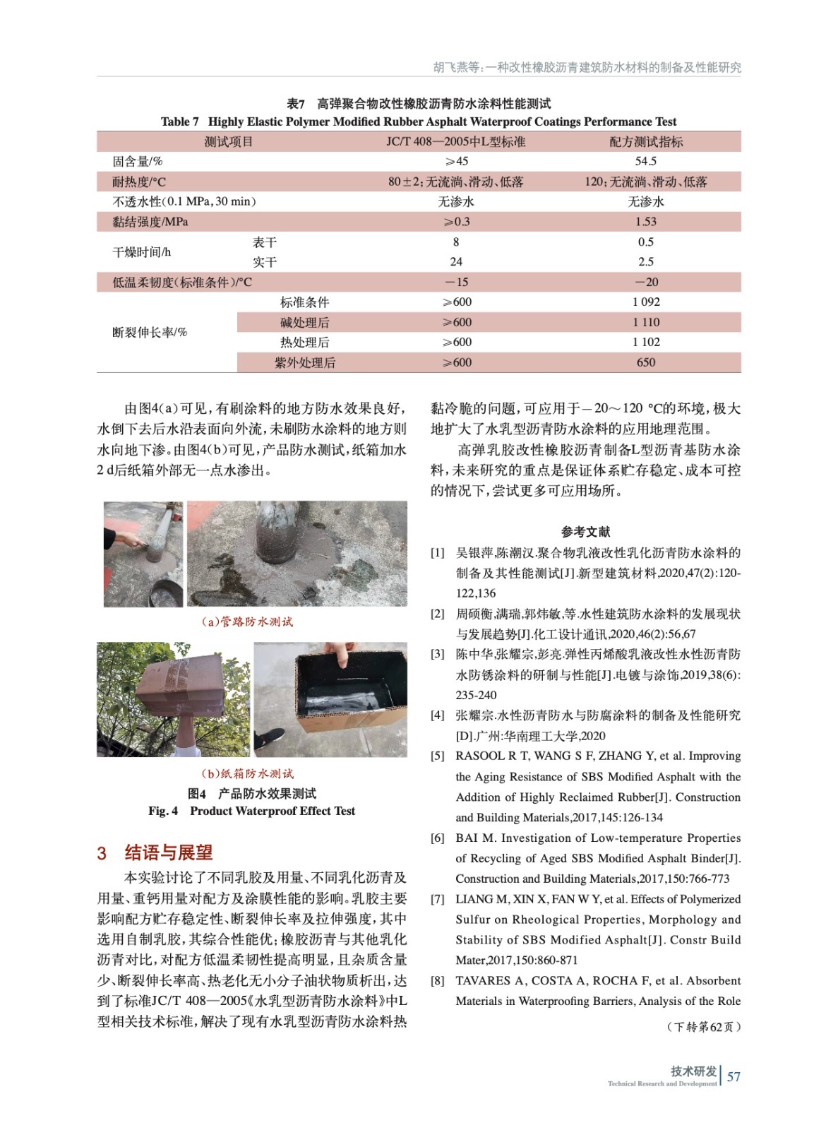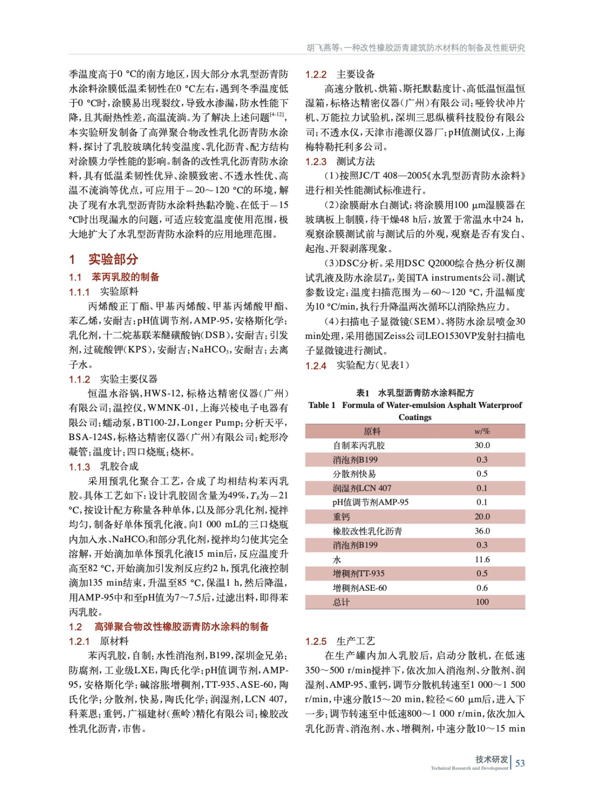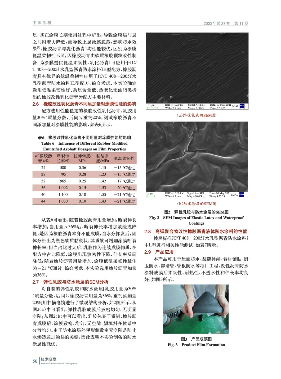 摘要:為了改善水乳型瀝青建筑防水涂料熱黏冷脆的缺點,自制了Tg為-21 ℃的高彈均相苯丙乳膠,探討了聚合物乳液、乳化瀝青的種類及添加量、重鈣的添加量對防水涂膜性能的影響。用掃描電鏡對防水涂層的微觀結(jié)構(gòu)進行了分析,用差熱分析儀DSC、高低溫恒溫恒濕箱、萬能材料試驗機、電動不透水儀等對防水涂層的玻璃化溫度、低溫柔韌性、耐熱度、機械性能、防滲透性能等進行測試。結(jié)果表明,當添加自制苯丙乳膠30%(質(zhì)量分數(shù),后同)、橡膠乳化瀝青36%、重鈣20%時,制備的液體防水涂料涂膜斷裂伸長率為1 092%,低溫柔韌性通過-20 ℃,120 ℃無流淌、滑動。