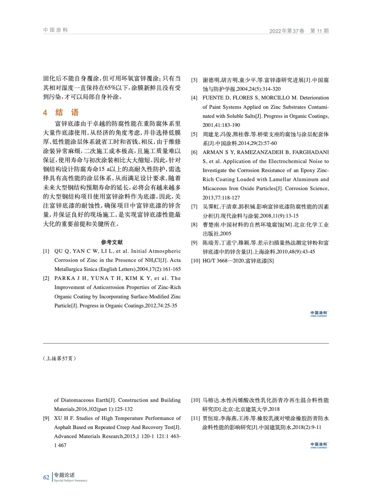 摘要:通過分析鋅在熱力學上比鐵易于發生腐蝕,但動力學上鋅的腐蝕速率遠低于鐵,為富鋅底漆的長效防腐保護機理找到理論依據。通過研究不同標準對富鋅底漆不揮發分中的鋅含量要求,指出鋅粉在富鋅底漆中起到了十分關鍵的作用,必須在涂膜中保持一定的含量。通過比較環氧富鋅底漆和無機硅酸富鋅底漆的性能,指出必須對富鋅底漆的現場施工產生足夠的重視。