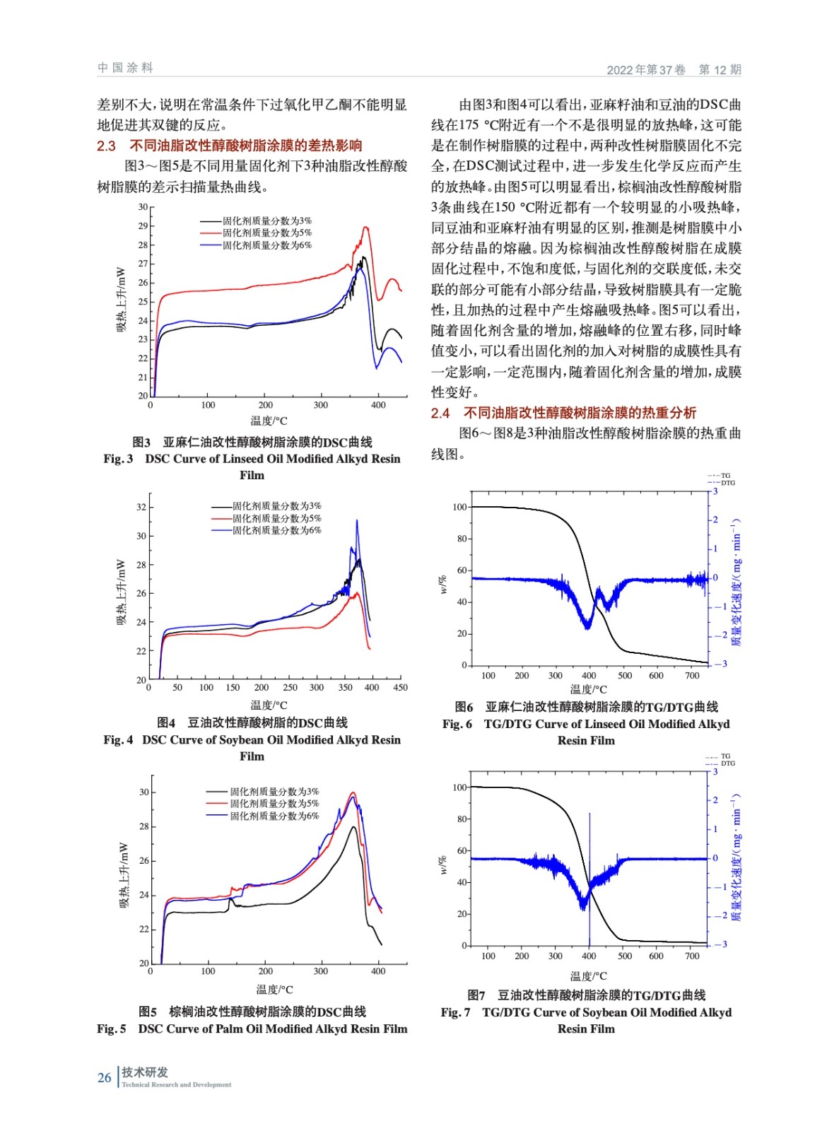 摘要:研究了基于亞麻籽油、豆油、棕櫚油相同油度(約52%~55%)植物油改性醇酸樹脂的成膜性能。利用過氧化甲乙酮(MEKP)作為固化劑,對醇酸樹脂涂膜在空氣中的時間、硬度、附著力、光澤度、沖擊強度、耐化學性和熱性能與未加固化劑的醇酸樹脂涂膜進行了研究和比較。結果表明,過氧化甲乙酮對亞麻籽油和豆油改性的醇酸樹脂成膜性有一定的改善。通過熱重分析探測到亞麻籽油改性醇酸樹脂涂膜的分解溫度比較高,分解速度慢,耐熱性能更好。在差熱分析(DSC)的測試中發現棕櫚油改性醇酸樹脂涂膜的成膜的交聯度低,并且有小部分結晶,產生了熔融吸熱峰,驗證了棕櫚油改性醇酸樹脂的脆性。