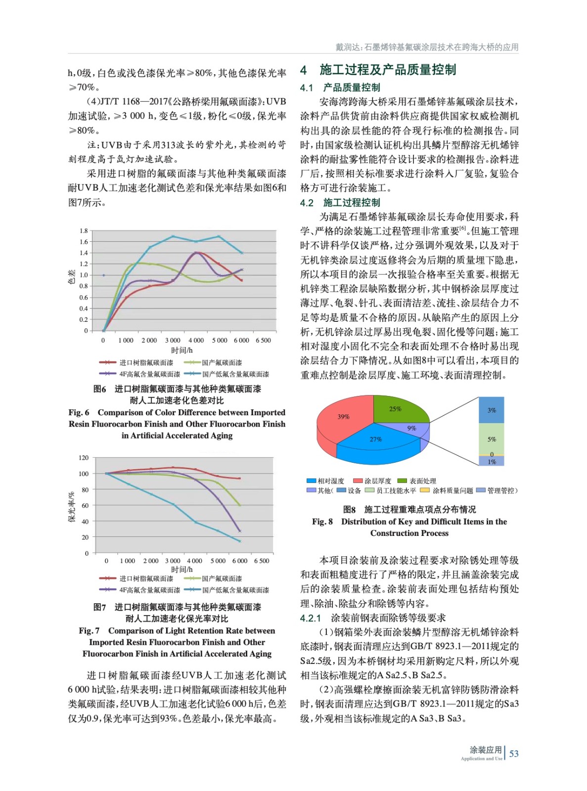 摘要:通過對(duì)福廈高鐵安海灣跨海大橋的腐蝕環(huán)境和腐蝕因素分析,結(jié)合大橋涂裝防腐壽命要求,設(shè)計(jì)了高性能石墨烯鋅基氟碳涂層技術(shù)。采用鱗片型醇溶無機(jī)烯鋅涂料作底涂層,環(huán)氧云鐵(厚漿)涂料作為中間涂層,進(jìn)口樹脂氟碳面漆作為面涂層;通過耐鹽霧、與水接觸角、附著力、人工氣候老化等測(cè)試方法對(duì)涂層性能進(jìn)行了評(píng)價(jià),對(duì)福廈高鐵安海灣跨海大橋表面防腐涂層體系進(jìn)行了研究;通過涂裝前表面處理、防腐涂裝體系要求和涂料產(chǎn)品技術(shù)要求等方面,嚴(yán)格控制大橋涂裝質(zhì)量,使配套體系滿足福廈高鐵安海灣跨海大橋使用壽命要求。
