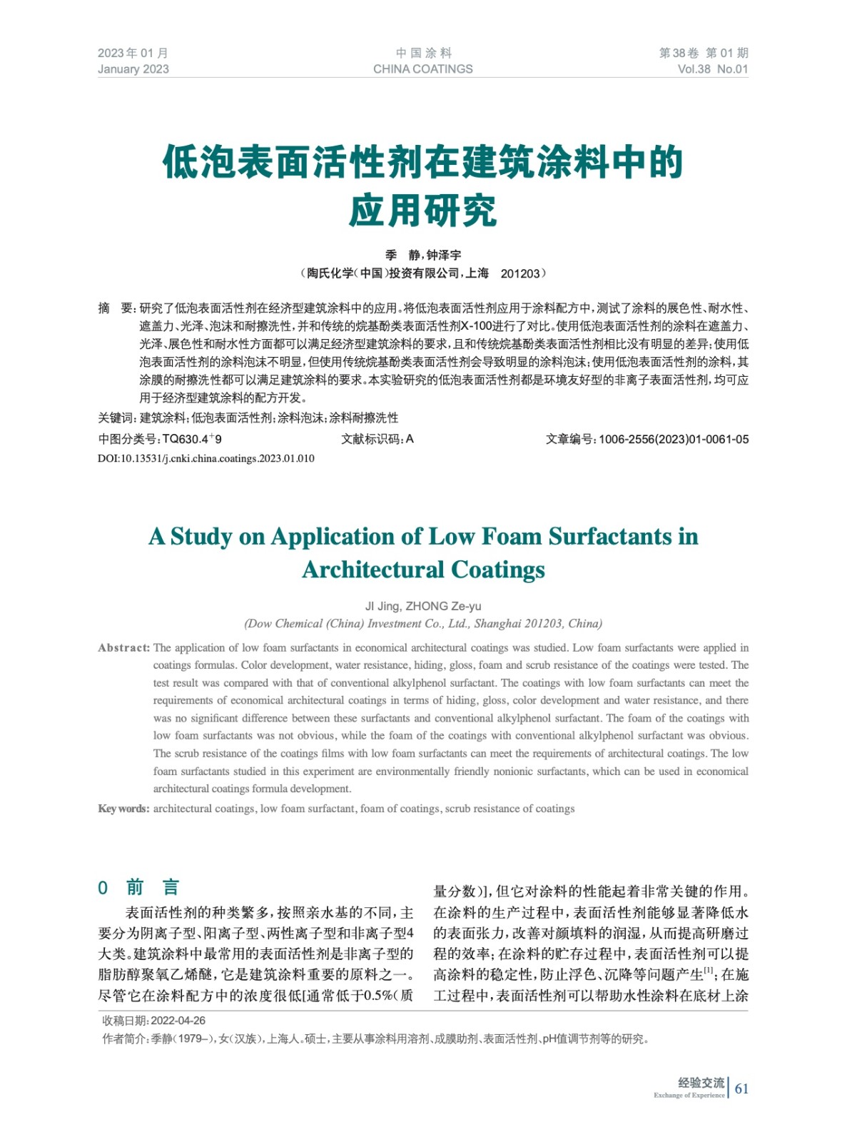 摘要:研究了低泡表面活性劑在經濟型建筑涂料中的應用。將低泡表面活性劑應用于涂料配方中,測試了涂料的展色性、耐水性、遮蓋力、光澤、泡沫和耐擦洗性,并和傳統的烷基酚類表面活性劑X-100進行了對比。使用低泡表面活性劑的涂料在遮蓋力、光澤、展色性和耐水性方面都可以滿足經濟型建筑涂料的要求,且和傳統烷基酚類表面活性劑相比沒有明顯的差異;使用低泡表面活性劑的涂料泡沫不明顯,但使用傳統烷基酚類表面活性劑會導致明顯的涂料泡沫;使用低泡表面活性劑的涂料,其涂膜的耐擦洗性都可以滿足建筑涂料的要求。本實驗研究的低泡表面活性劑都是環境友好型的非離子表面活性劑,均可應用于經濟型建筑涂料的配方開發。