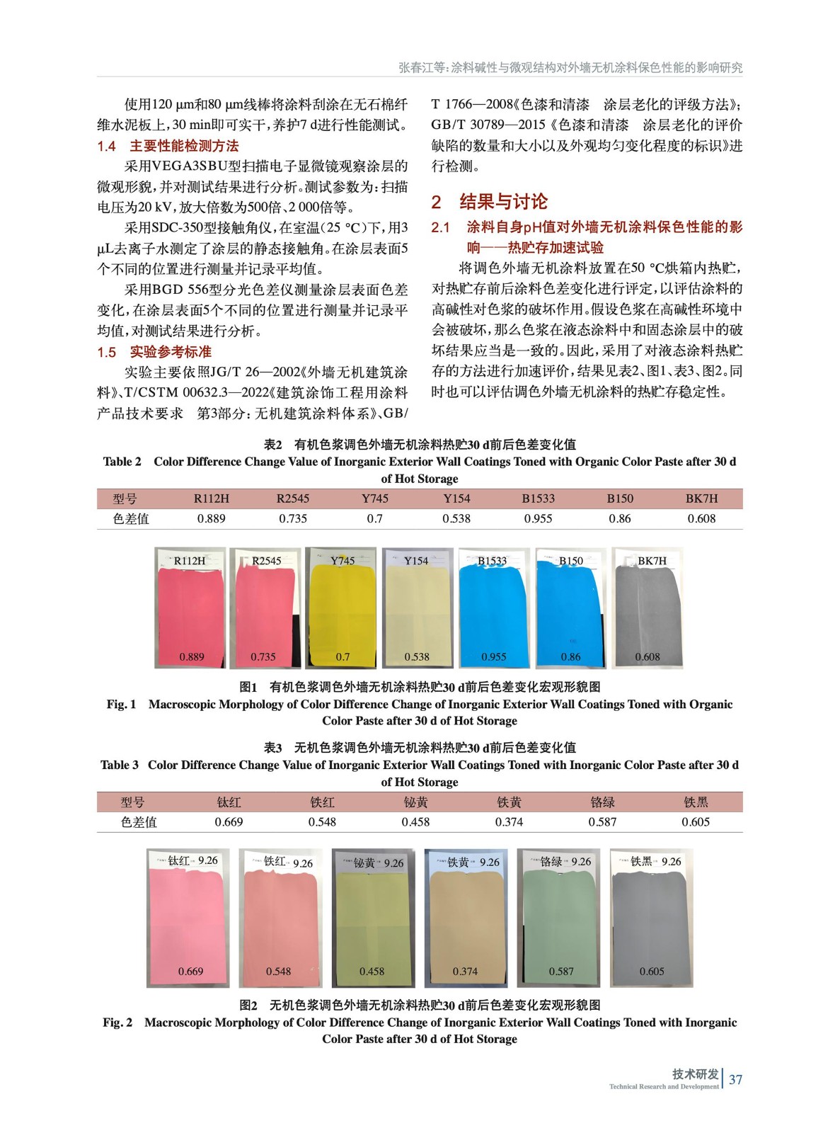 摘要:通過研究涂料堿性與微觀結構對外墻無機涂料保色性能的影響規律作了系統評價。采用SEM、水接觸角和分光色差儀對外墻無機涂料的保色性能進行研究。結果表明:涂料pH值對外墻無機涂料的長期耐候性影響不大,熱貯存30 d,熱貯前后涂料色差變化<1,肉眼幾乎無色差;兩款不同pH值外墻無機涂料調色樣板在戶外曝曬100 d后色差變化趨勢一致,沒有隨著pH值的變化造成色差變化的影響;無機涂料多孔的特點對色差影響最大,乳液含量的增加,可以提升無機涂層對色漿的包裹性能;無機色漿粒徑大,在多孔的無機涂料中更穩定,不易褪色。