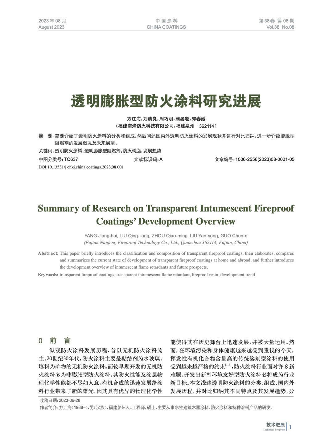 簡要介紹了透明防火涂料的分類和組成,然后闡述國內外透明防火涂料的發展現狀并進行對比歸納,進一步介紹膨脹型阻燃劑的發展概況及未來展望。
