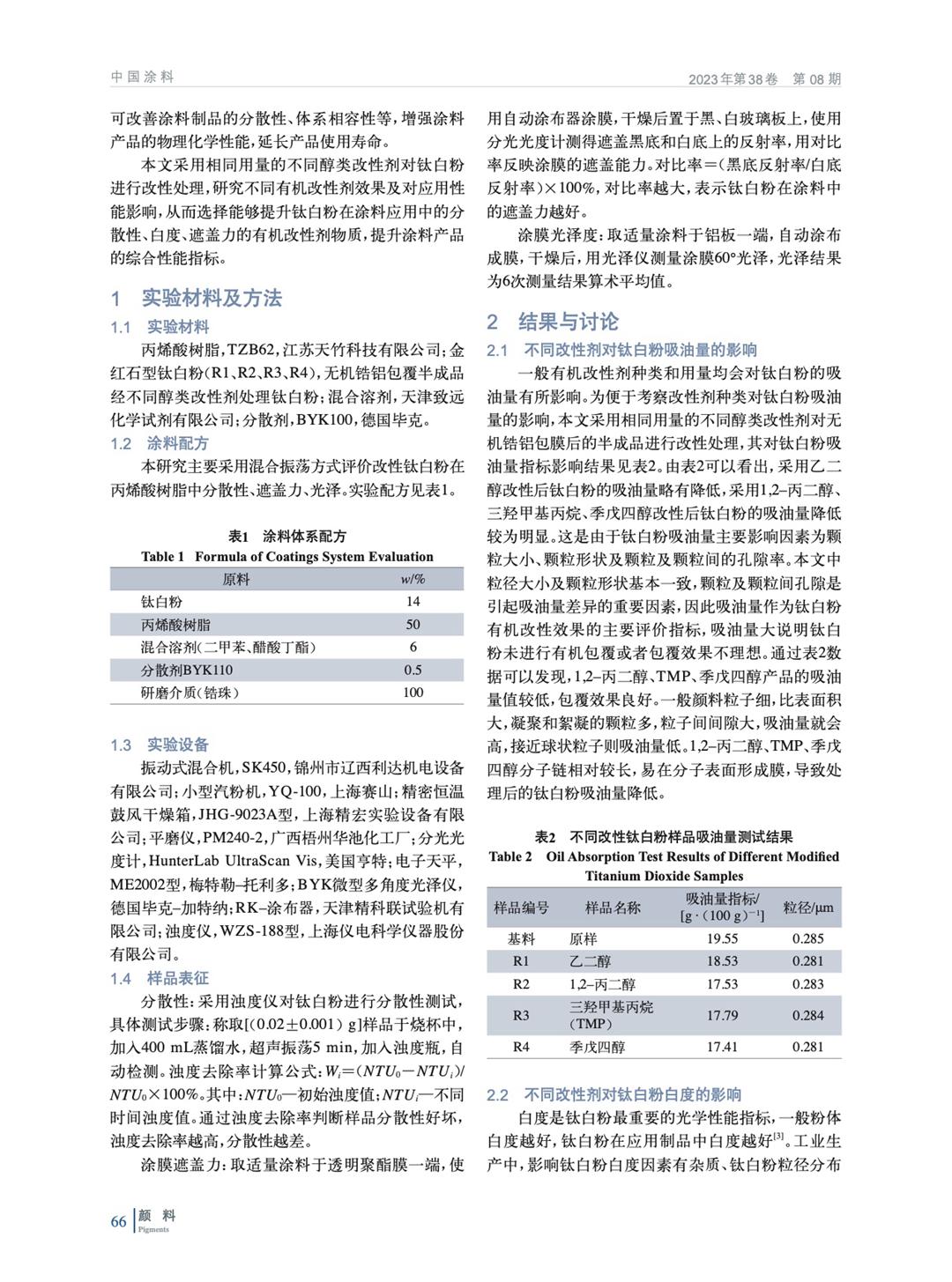 摘要:采用醇類有機劑對金紅石型鈦白粉進行有機表面改性,實驗研究不同醇類改性劑對鈦白粉改性效果。并評價改性鈦白粉在涂料體系中分散性、遮蓋力、光澤等影響。實驗結(jié)果表明:采用改性鈦白粉R3產(chǎn)品粉體指標、分散穩(wěn)定性及涂料體系性能均較好。通過紅外光譜表征,有機改性劑在鈦白粉表面形成包覆。