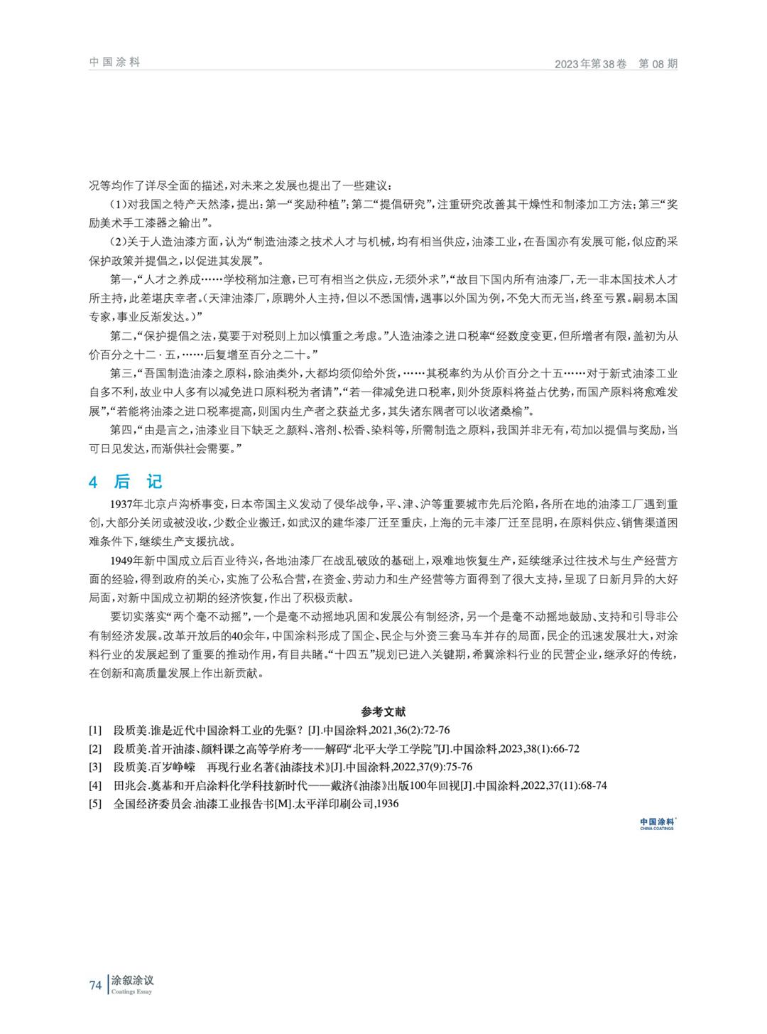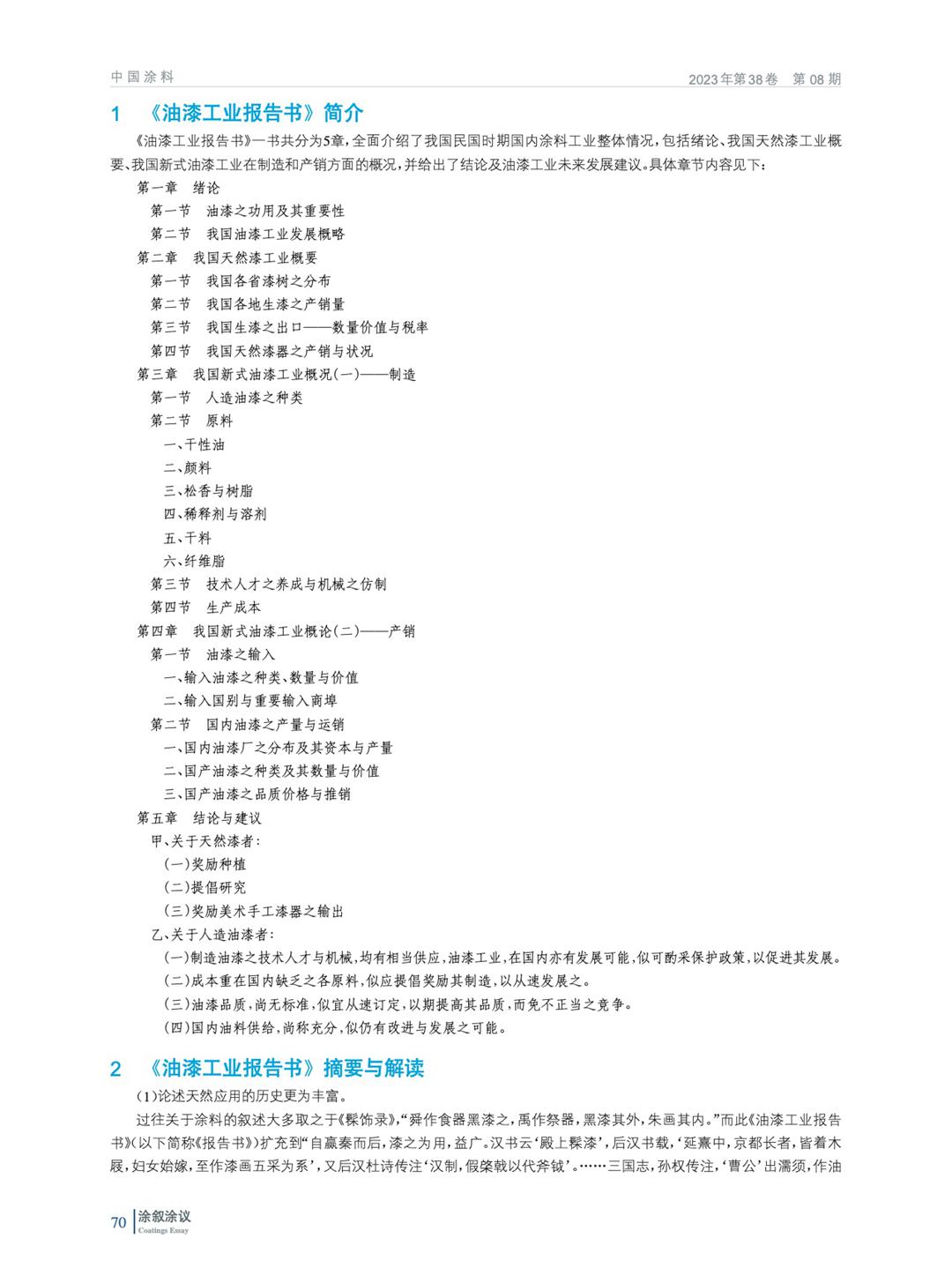 摘要:《油漆工業(yè)報告書》由民國時期的全國經(jīng)濟委員會撰寫,出版于1936年8月,全面地介紹了中國現(xiàn)代油漆(涂料)工業(yè)興起的歷史,從古代中國使用天然漆的歷史講起,涵蓋了現(xiàn)代油漆的制造、原料、機械、進出口貿易和培養(yǎng)人才等方面,內容豐富翔實,參考中外文獻多達51種,洋洋灑灑約5萬余字,全面展現(xiàn)了民國時期涂料行業(yè)“黃金十年”的面貌,不失為彼時的行業(yè)百科全書。一些好的傳統(tǒng)和經(jīng)驗,于今日仍有其現(xiàn)實的意義,可供參考。