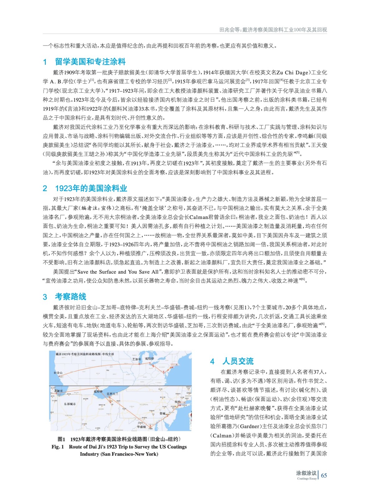 摘要:100年前的1923年,戴濟(字汝楫)考察美國涂料業,時間跨度為1月31日至4月13日,歷時73天,主要沿舊金山–紐約一線,參觀至少34家工廠、13處公共機構,會晤37人,并寫成《游美紀程》一文,收錄在《油漆季刊(費府賽會號)》中,在10月10日于上海總商會商品陳列所第三次展覽會暨化學工藝展覽會(1923年)上,發表題為“美國油漆業之保面運動”的演講,促成杜赫于1924年來華“專為調查中國油漆事業及其原料”,也由此開啟和奠定中美涂料業的相互交流的基礎。當初這第一步走出去之時,正值我國從原始大漆、桐油開始轉型、現代涂料工業起步之際。此行作為中國涂料發展歷程的一個標志性和重大活動,本應是值得紀念的,由此再提和回視百年前的考察,也更應有其價值和意義。