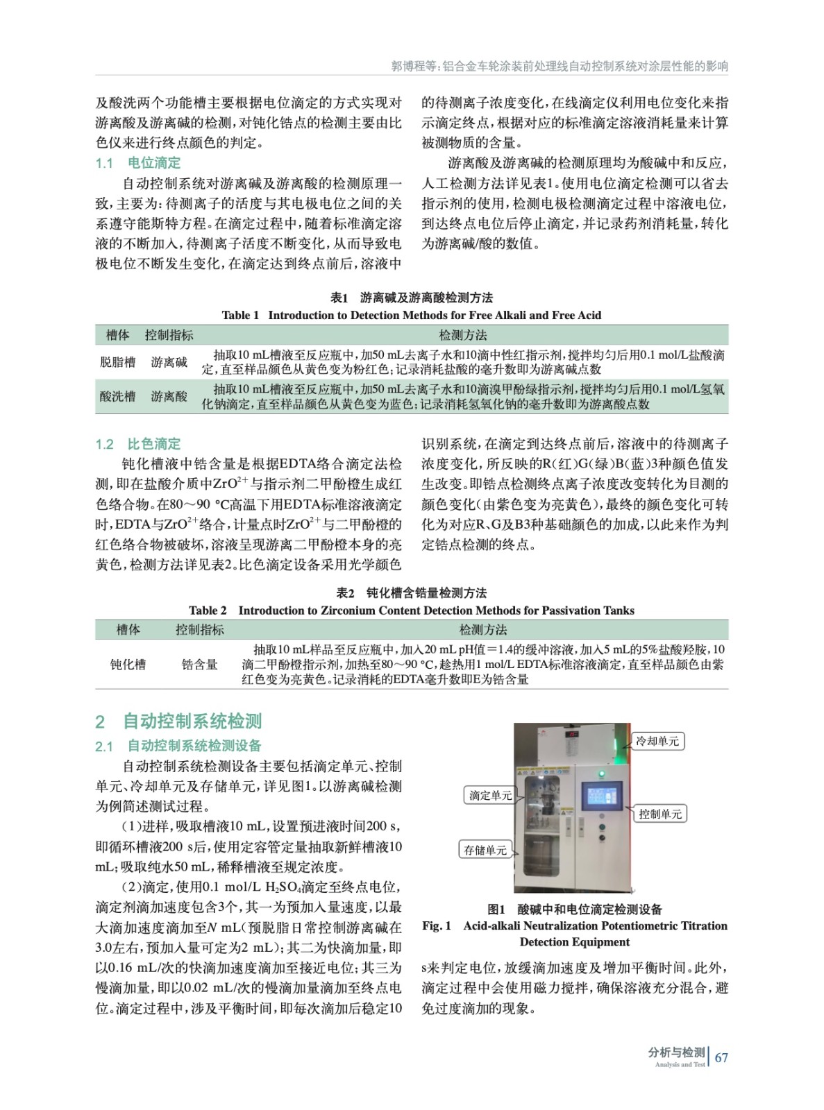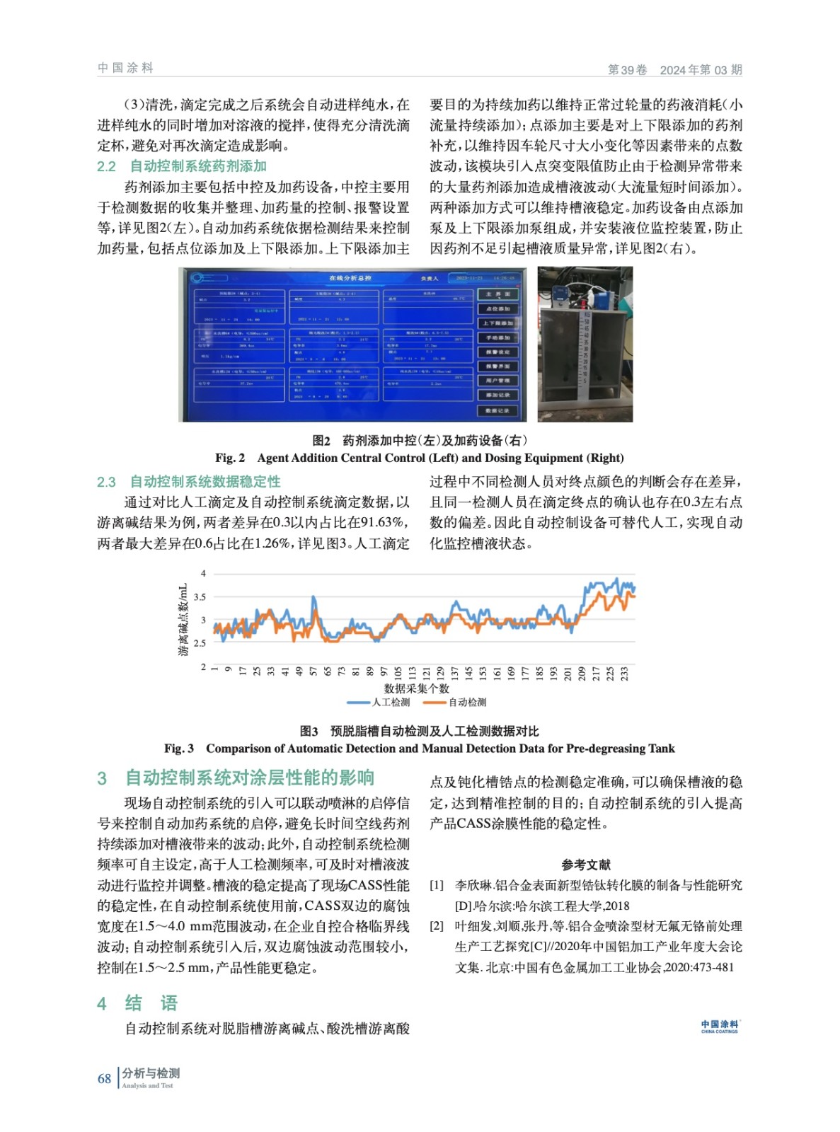 摘要:為提升鋁合金車(chē)輪涂裝線自動(dòng)化程度,在涂裝前處理引入自動(dòng)監(jiān)控系統(tǒng)。確定游離堿、游離酸及鋯點(diǎn)的檢測(cè)方法,依據(jù)檢測(cè)結(jié)果自動(dòng)調(diào)整加藥量。對(duì)比人工與設(shè)備檢測(cè)結(jié)果,監(jiān)控設(shè)備運(yùn)行穩(wěn)定性。