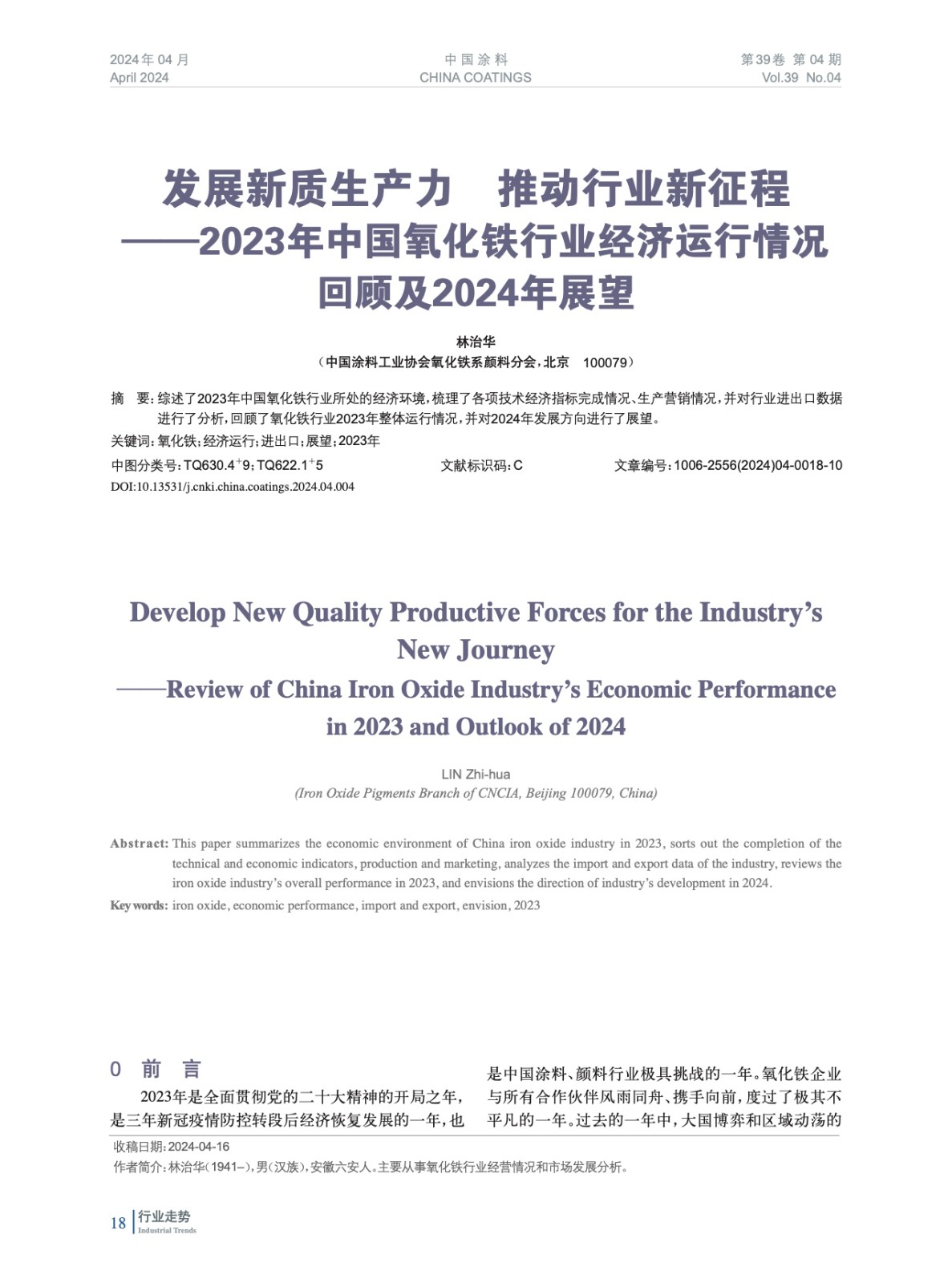 綜述了2023年中國氧化鐵行業所處的經濟環境,梳理了各項技術經濟指標完成情況、生產營銷情況,并對行業進出口數據進行了分析,回顧了氧化鐵行業2023年整體運行情況,并對2024年發展方向進行了展望。