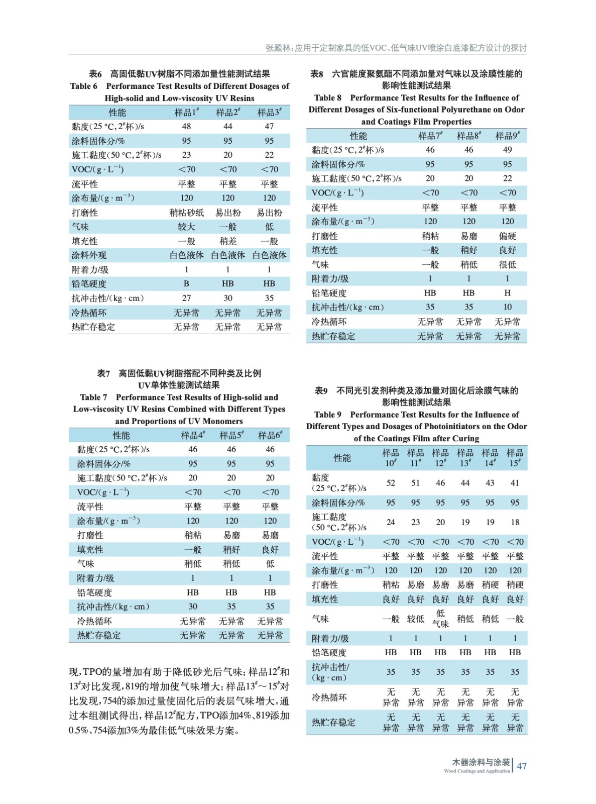 摘要:主要通過使用高固低黏的UV樹脂搭配UV單體減少有機(jī)溶劑添加量,以及添加一定比例的高官能度聚氨酯和深層光引發(fā)劑來實(shí)現(xiàn)深層固化的交聯(lián)密度,通過對光引發(fā)劑的復(fù)配與不同比例的添加,來進(jìn)一步降低固化后氣味。同時(shí)對層間連涂測試以及在配方設(shè)計(jì)時(shí)遇到的一些其他需要注意事項(xiàng)做了介紹。