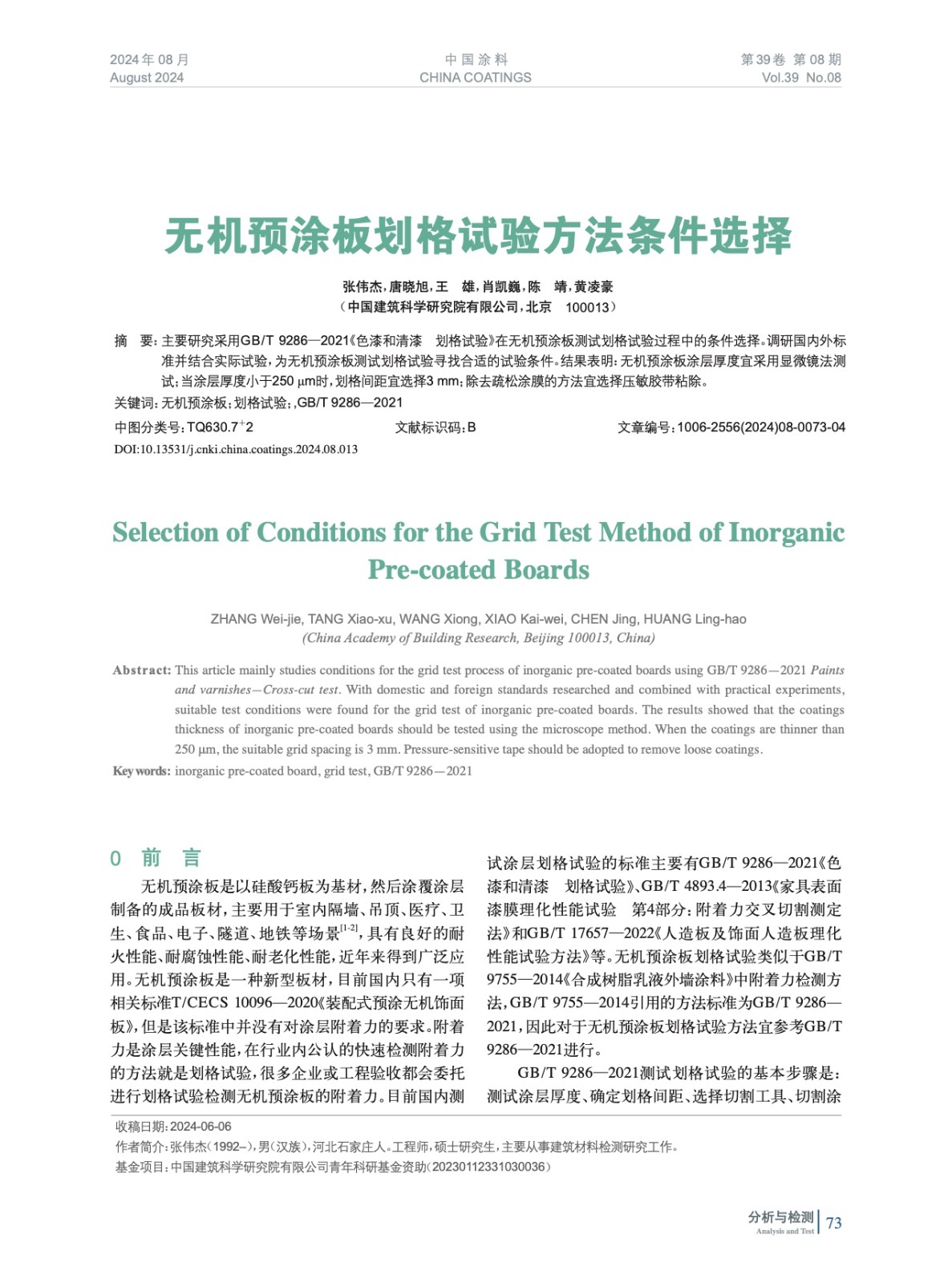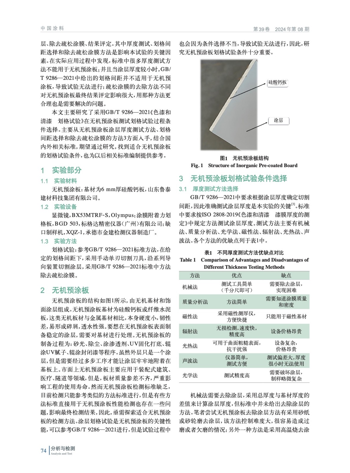摘要:主要研究采用GB/T 9286—2021《色漆和清漆 劃格試驗》在無機預涂板測試劃格試驗過程中的條件選擇。調研國內外標準并結合實際試驗,為無機預涂板測試劃格試驗尋找合適的試驗條件。結果表明:無機預涂板涂層厚度宜采用顯微鏡法測試;當涂層厚度小于250 μm時,劃格間距宜選擇3 mm;除去疏松涂膜的方法宜選擇壓敏膠帶粘除。