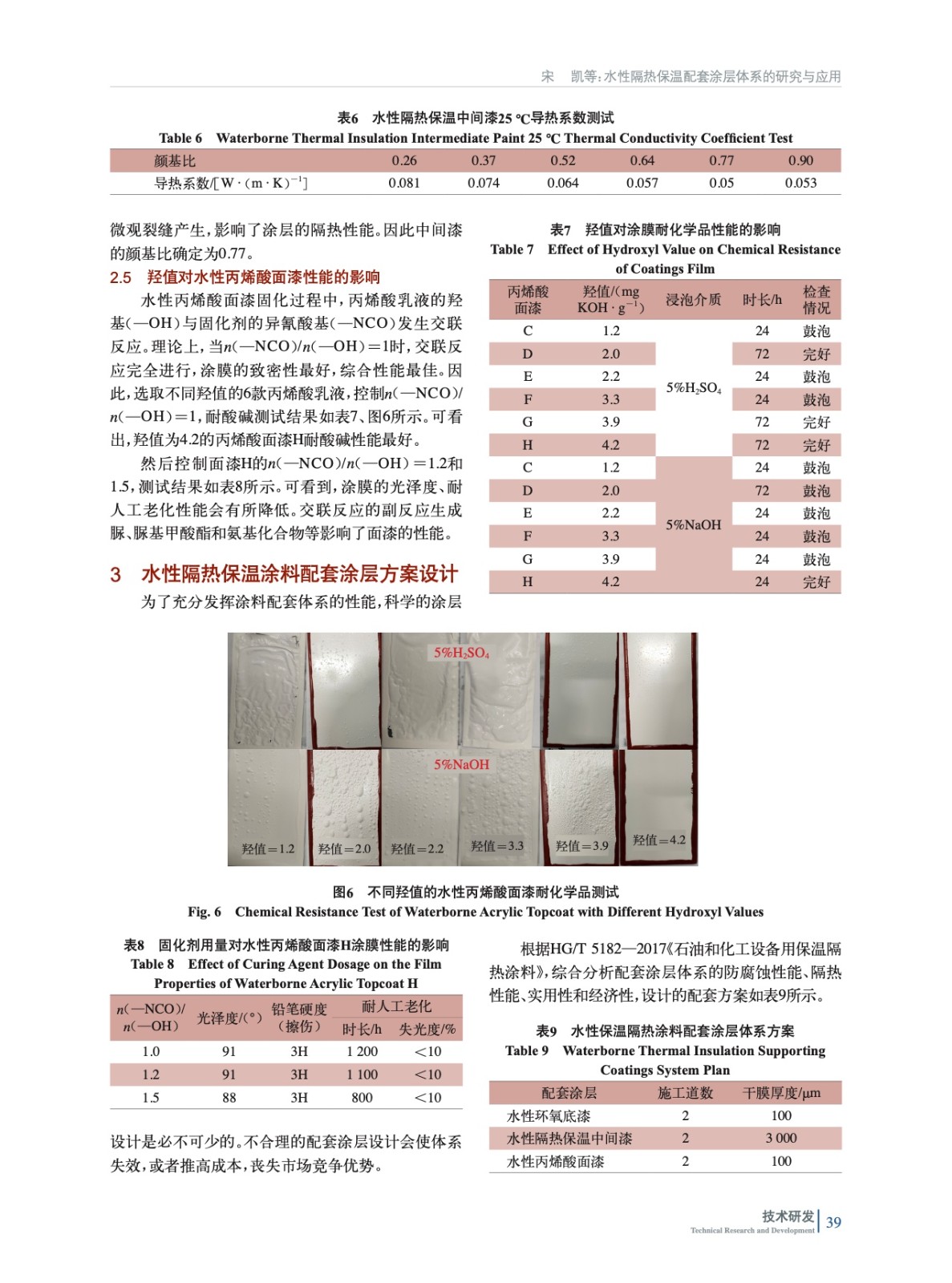 摘要:以“水性環氧底漆+水性隔熱保溫中間漆+水性丙烯酸面漆”構建隔熱保溫配套涂層體系。通過測試其耐腐蝕性、耐老化性、隔熱保溫等性能,對隔熱保溫配套涂層的性能進行評價。結果表明:水性環氧底漆A顏基比為0.85;水性隔熱保溫中間漆B選用規格為D90=110 μm的玻璃微珠,顏基比為0.77;水性丙烯酸面漆H羥值為4.2,n(—NCO)/n(—OH)=1時,涂層配套體系兼顧隔熱性能與耐腐蝕性,表現良好。