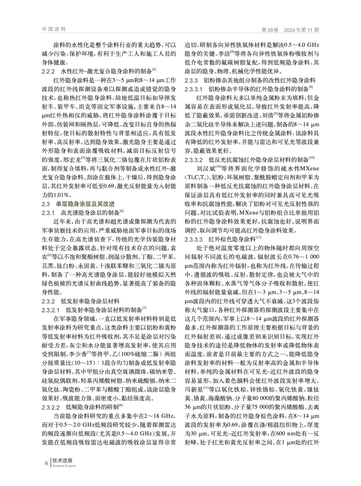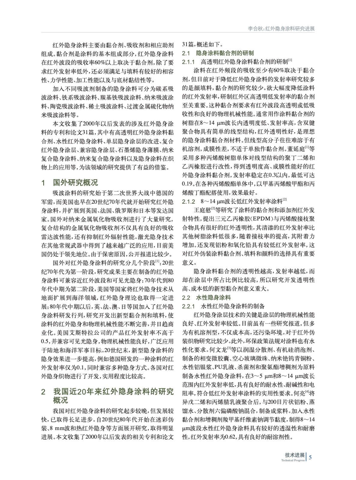 摘要:概述了隱身技術(shù)的含義和世界各國的研究進(jìn)展,重點(diǎn)敘述了我國近20年來紅外隱身涂料的研究現(xiàn)狀。收集了2000年以后發(fā)表的有代表性的專利和論文,覆蓋高透明紅外隱身涂料黏合劑、水性紅外隱身涂料、單層隱身涂層的改進(jìn)、復(fù)合紅外隱身涂層、兼容隱身涂層、石墨烯隱身薄膜、納米復(fù)合隱身涂料制備等,為該領(lǐng)域進(jìn)一步研究提供了有益的借鑒。