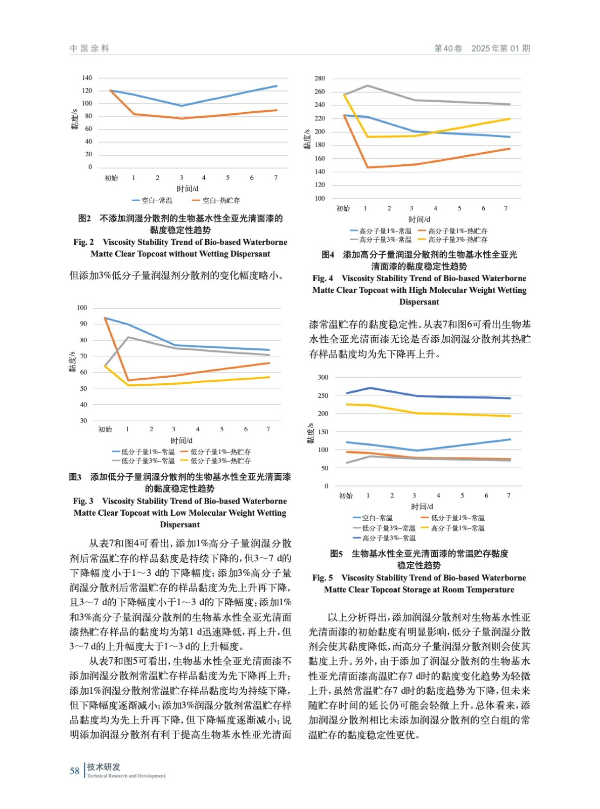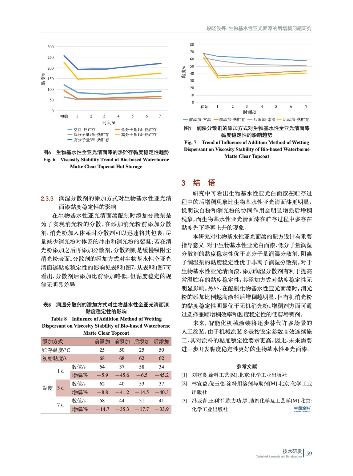 摘要:分析了消光粉、增稠劑、分散劑的種類和添加比例以及分散劑的添加方式對生物基水性亞光面漆黏度穩(wěn)定性的影響規(guī)律。研究表明,生物基水性亞光白面漆在貯存過程中的后增稠現(xiàn)象比生物基水性亞光清面漆更明顯,說明鈦白粉和消光粉的協(xié)同作用會明顯增強(qiáng)后增稠現(xiàn)象,而生物基水性亞光清面漆在貯存過程中多存在黏度先下降再上升的現(xiàn)象。高溫貯存會加速其后增稠;消光粉添加比例越高后增稠越明顯;采用高剪、中剪和低剪增稠劑配制的生物基水性亞光白面漆一定程度上的后增稠程度依次提高,但有些低剪增稠劑兼顧增稠效率和黏度穩(wěn)定性的優(yōu)勢。低分子量潤濕分散劑的黏度穩(wěn)定性優(yōu)于高分子量潤濕分散劑,陰離子潤濕劑的黏度穩(wěn)定性優(yōu)于非離子潤濕分散劑。