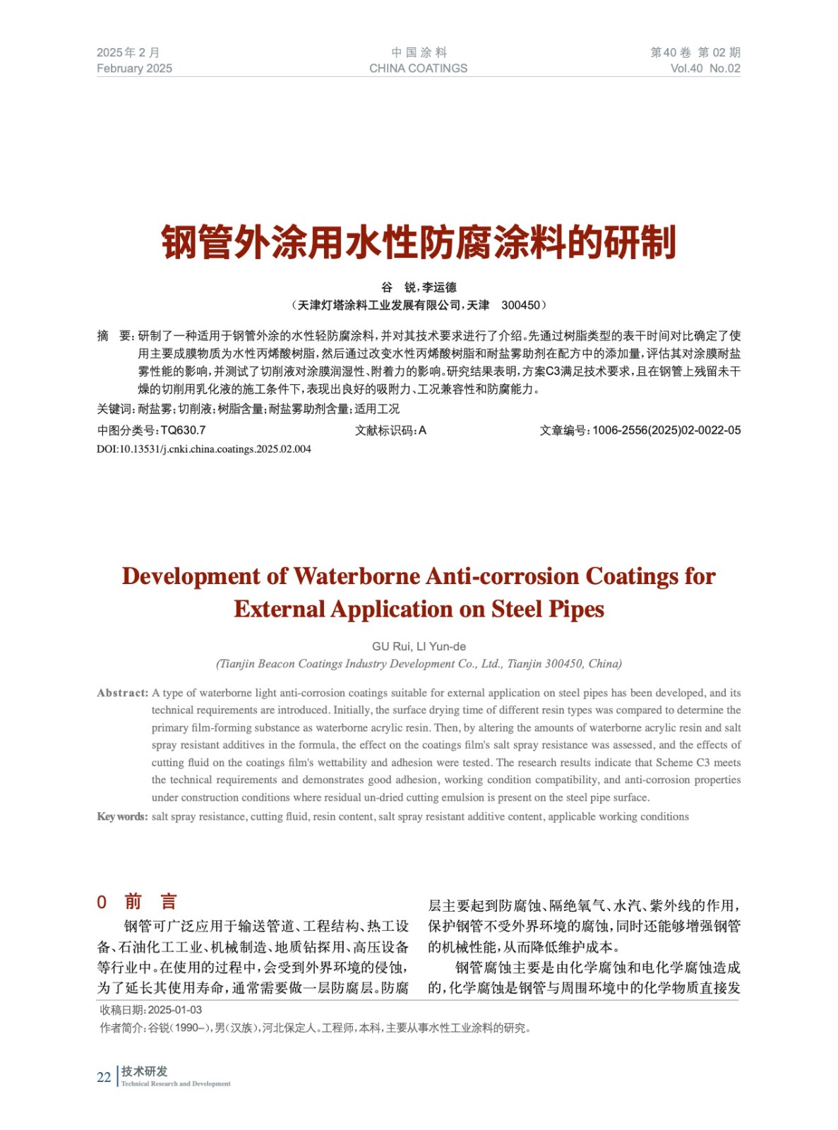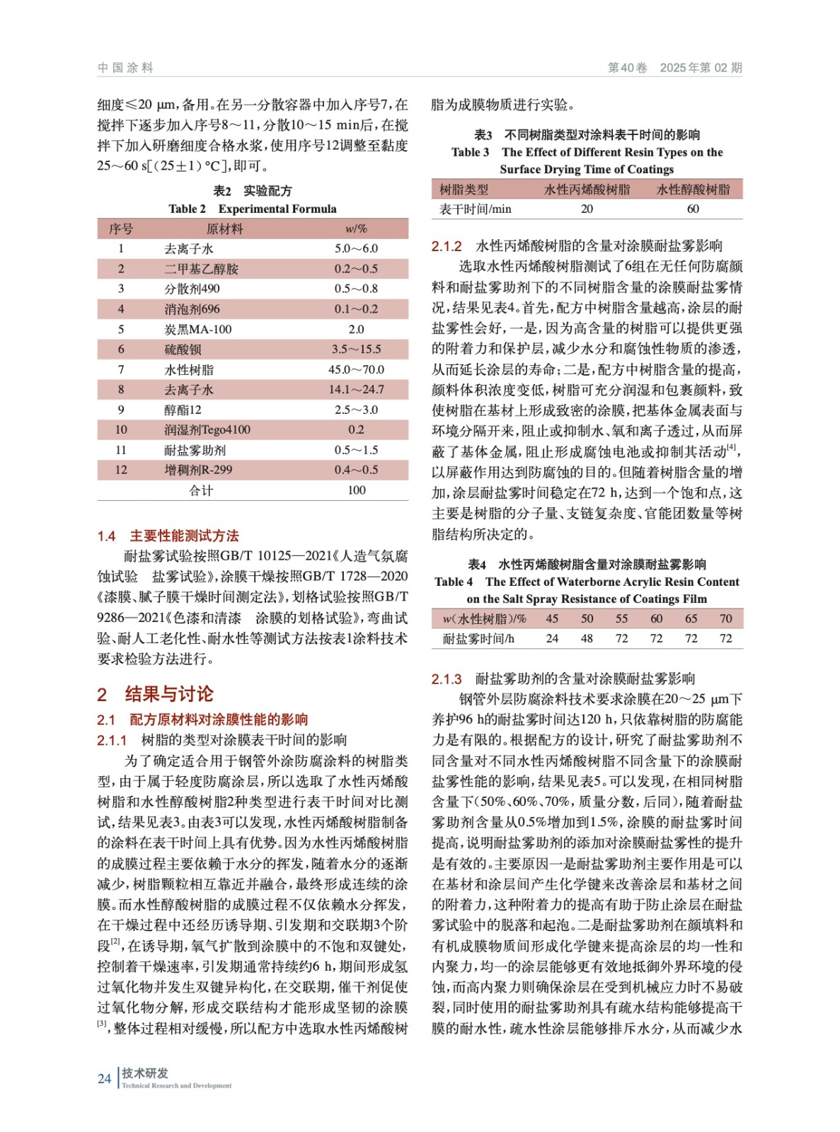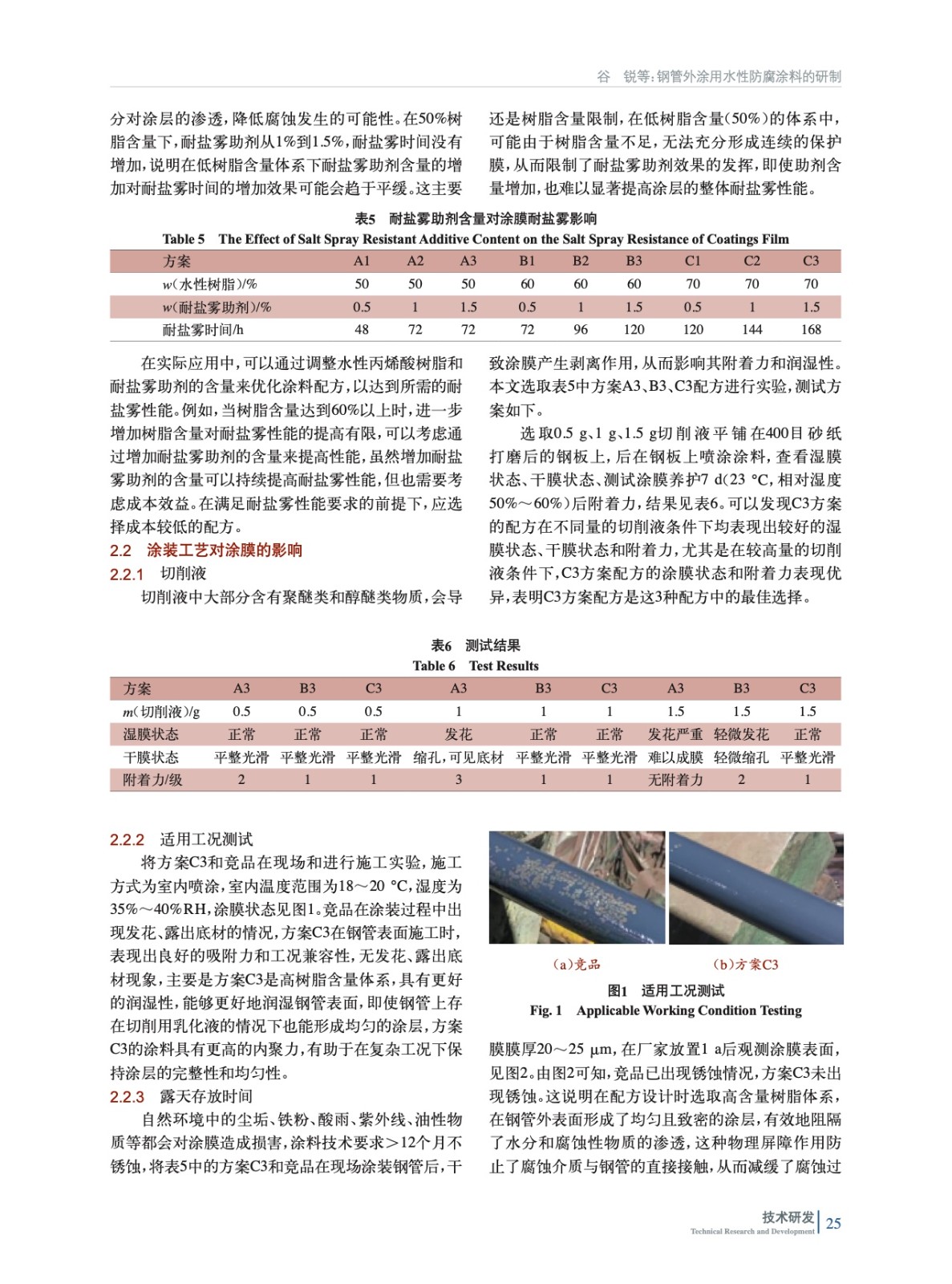 摘要:研制了一種適用于鋼管外涂的水性輕防腐涂料,并對其技術要求進行了介紹。先通過樹脂類型的表干時間對比確定了使用主要成膜物質為水性丙烯酸樹脂,然后通過改變水性丙烯酸樹脂和耐鹽霧助劑在配方中的添加量,評估其對涂膜耐鹽霧性能的影響,并測試了切削液對涂膜潤濕性、附著力的影響。研究結果表明,方案C3滿足技術要求,且在鋼管上殘留未干燥的切削用乳化液的施工條件下,表現出良好的吸附力、工況兼容性和防腐能力。