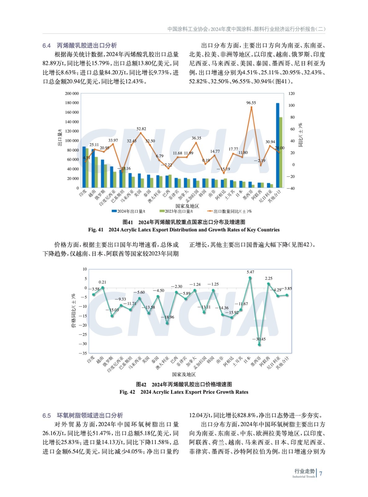 摘要:簡析了2024年中國宏觀經濟及外部環境發展情況,概括介紹了2024年房地產、機械、集裝箱、船舶、家具、新能源等涂料重點下游行業、新興領域發展概況及對涂料行業的影響,重點分析了2024年度中國涂料行業發展和進出口情況。綜述了全球涂料行業發展概況,對2024年全球涂料行業發展影響因素、全球涂料行業增長動力、全球涂料行業細分領域趨勢進行了分析。最后對涂料上游鈦白粉、氧化鐵、丙烯酸乳液和環氧樹脂等重點原材料領域發展情況進行了概述,并對中國涂料行業特征和發展趨勢進行了分析和預測。