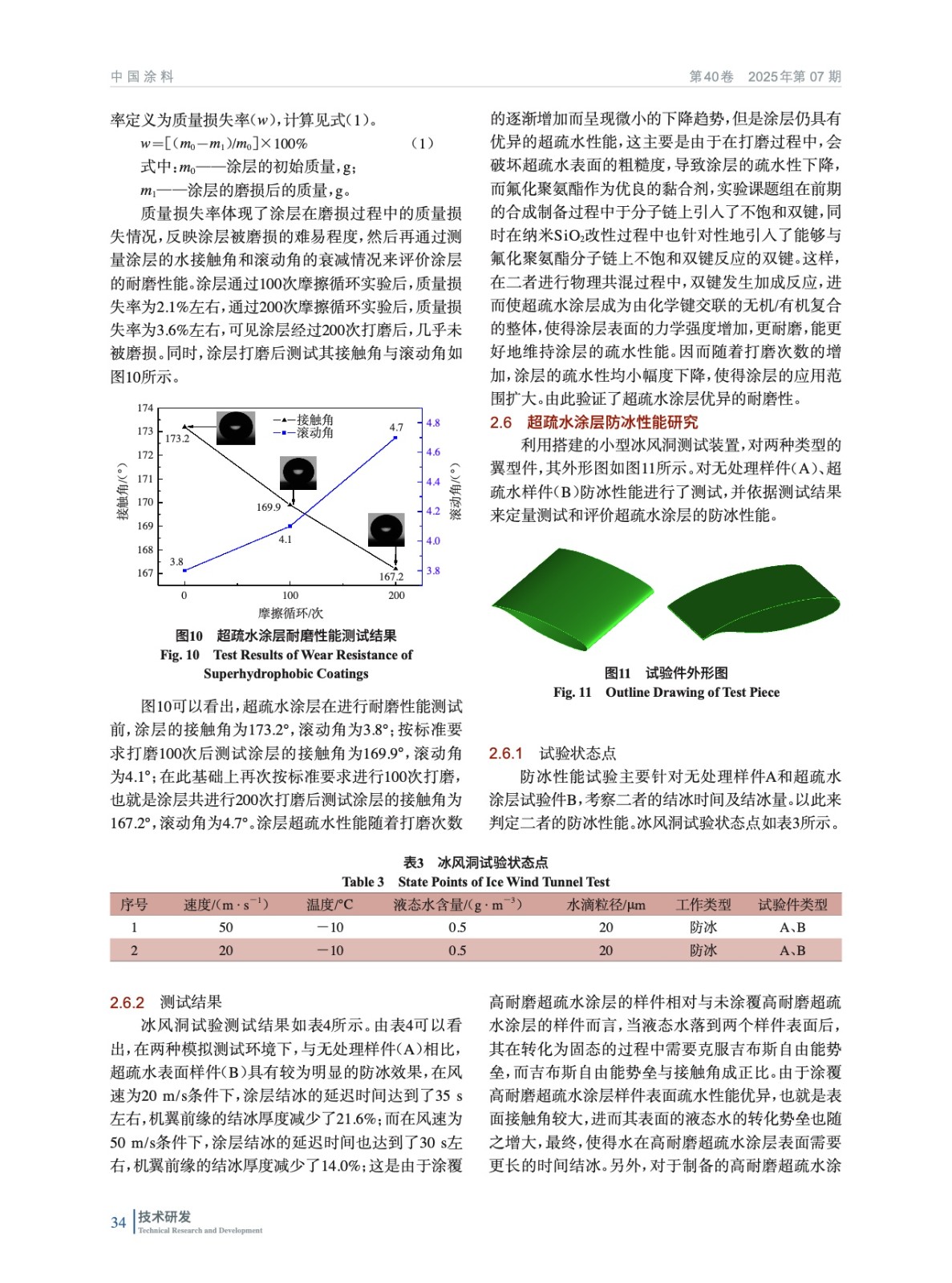 摘要:為了有效提高飛行器蒙皮表面涂層的防覆冰性能和耐磨性,以自制的高性能氟化聚氨酯和改性納米SiO2為原料,采用物理混合的方法成功制備出高耐磨超疏水涂層材料。探討了改性納米SiO2用量和粒徑大小對涂層疏水性能的影響。討論了不同溫度和不同pH值對涂層穩定性的影響。最后,對涂層的耐磨性及防冰性能進行了研究,改性納米SiO2的粒徑為100~400 nm,質量分數為7%左右時,涂層的疏水性能最佳。同時,涂層具有優異的耐磨和防冰性能,可在較寬的溫度及pH值范圍內使用,通過小型冰風洞試驗后,在風速為20 m/s條件下,涂覆高耐磨超疏水的涂層樣件相對于未涂覆高耐磨超疏水的涂層樣件的結冰時間延遲了35 s左右,機翼前緣的結冰厚度減少了21.6%;而在風速為50 m/s條件下,涂覆高耐磨超疏水涂層樣件相對于未涂覆高耐磨超疏水涂層樣件的結冰時間延遲了30 s左右,機翼前緣的結冰厚度減少了14.0%。合理控制超疏水涂層中改性納米SiO的用量和粒徑大小能夠顯著提高涂層防冰和耐磨性,涂層具有良好的應用潛力。