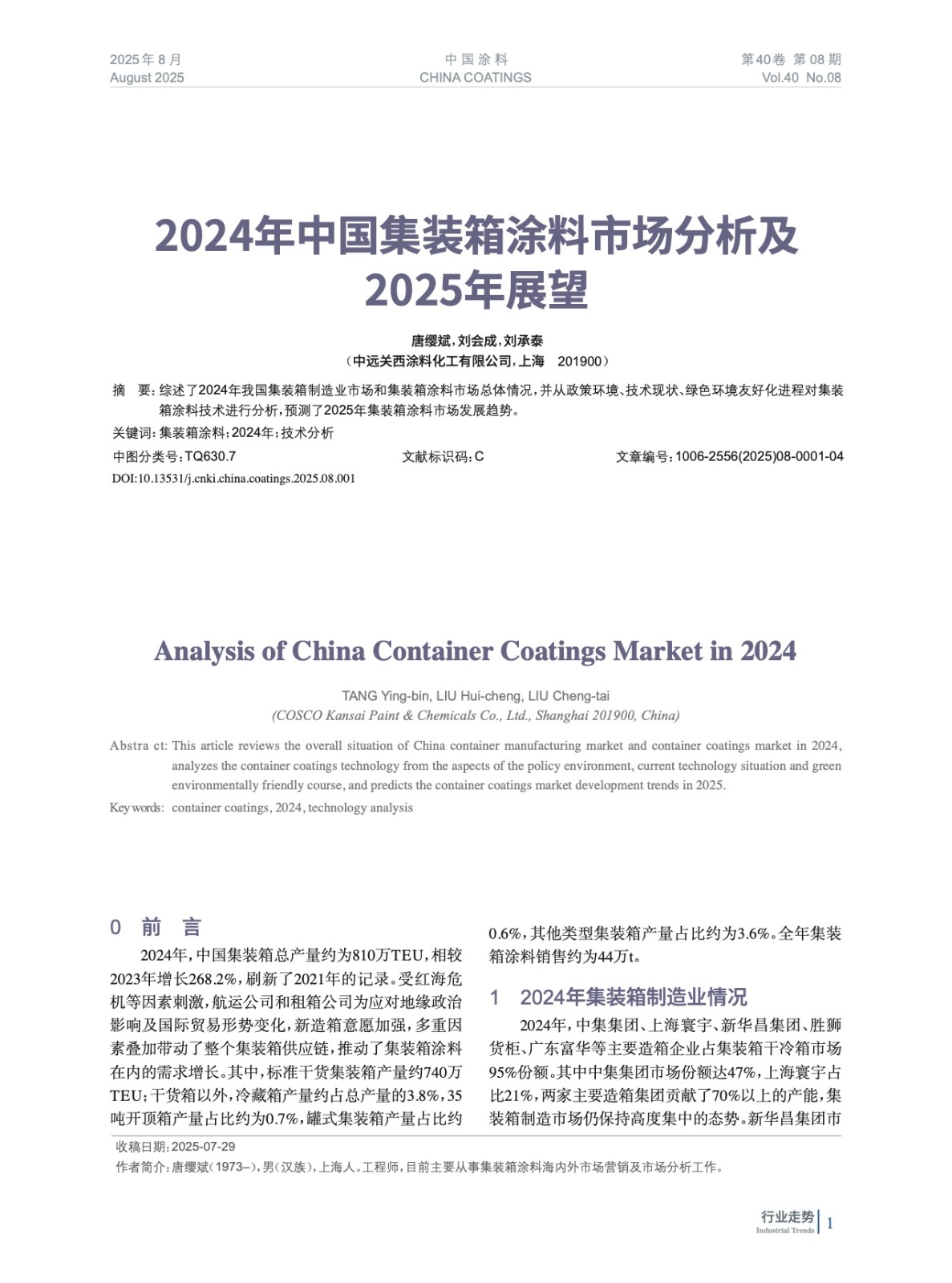 摘要:綜述了2024年我國集裝箱制造業(yè)市場和集裝箱涂料市場總體情況,并從政策環(huán)境、技術(shù)現(xiàn)狀、綠色環(huán)境友好化進程對集裝箱涂料技術(shù)進行分析,預(yù)測了2025年集裝箱涂料市場發(fā)展趨勢。