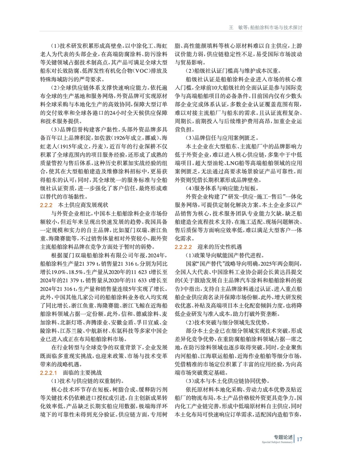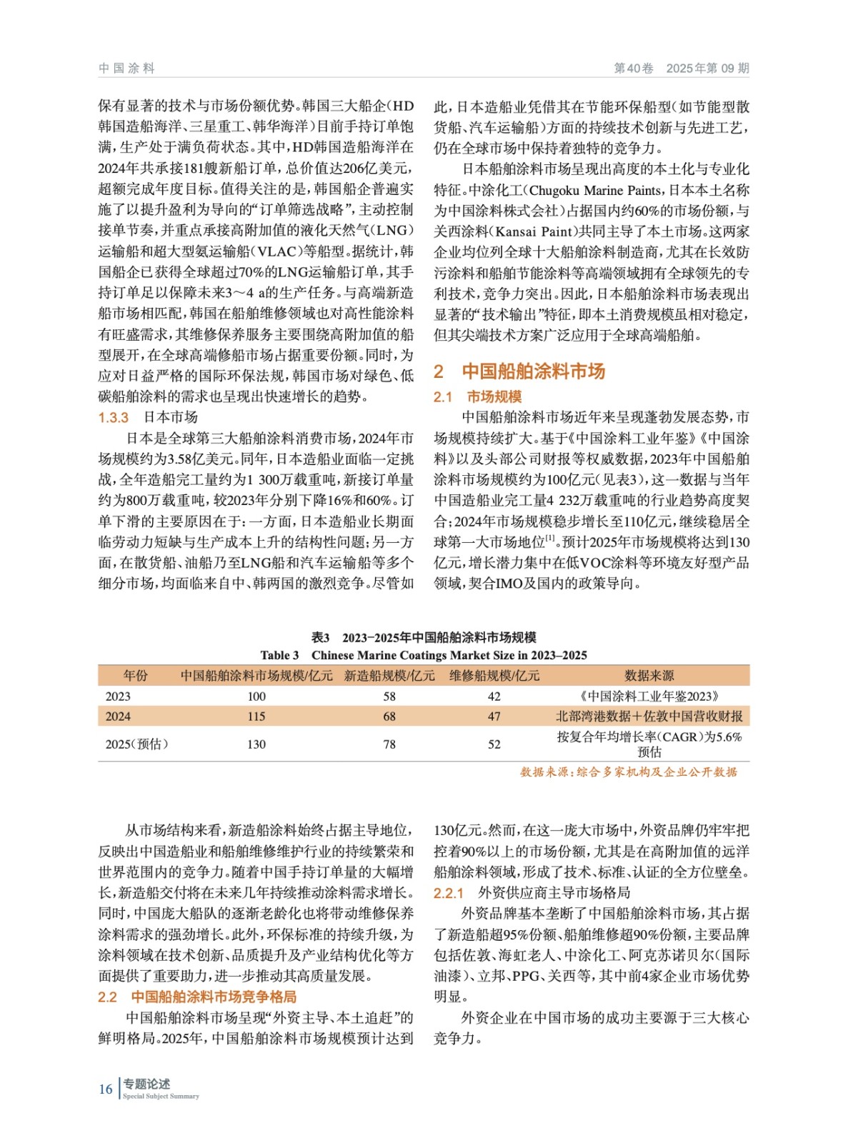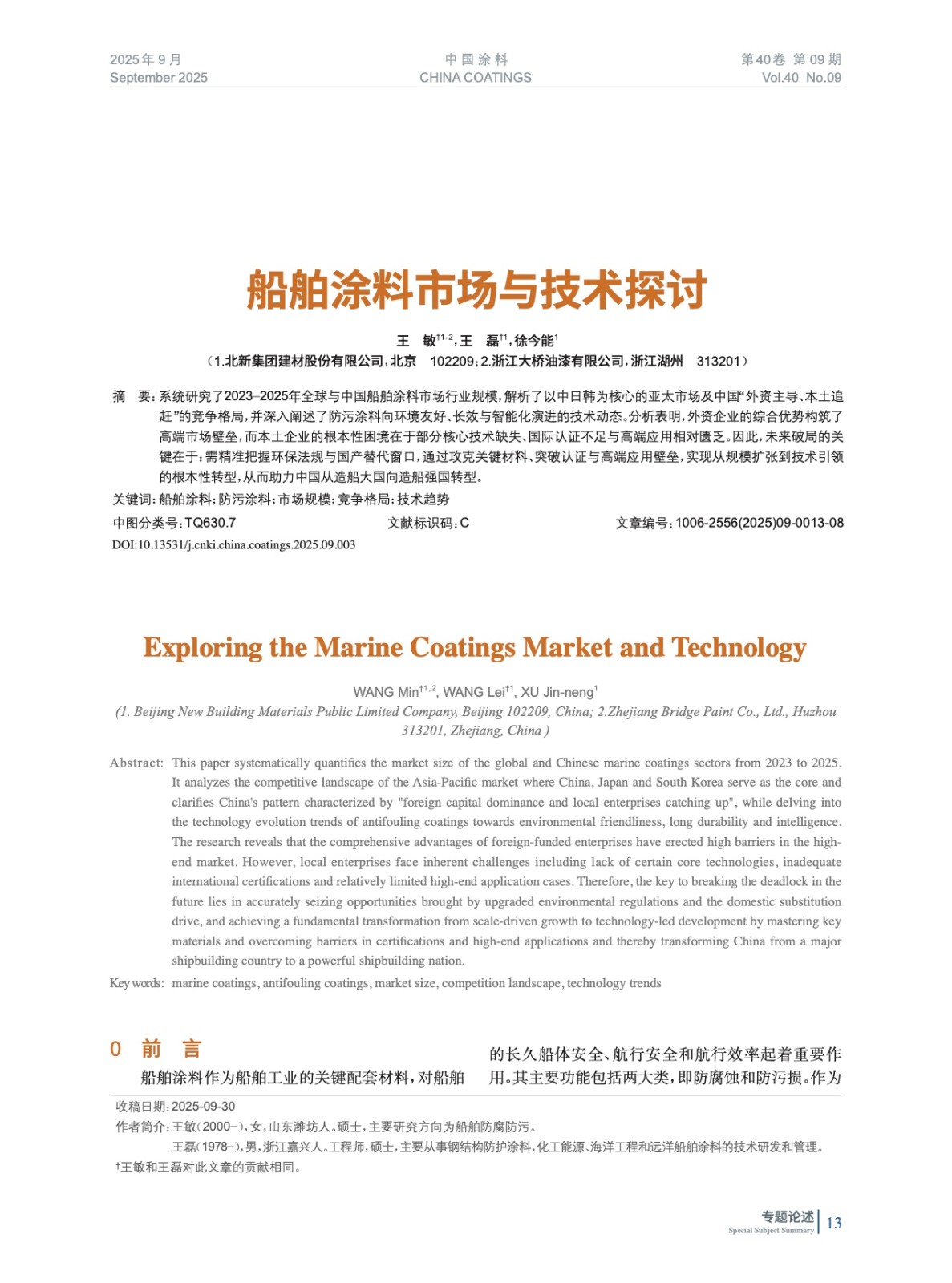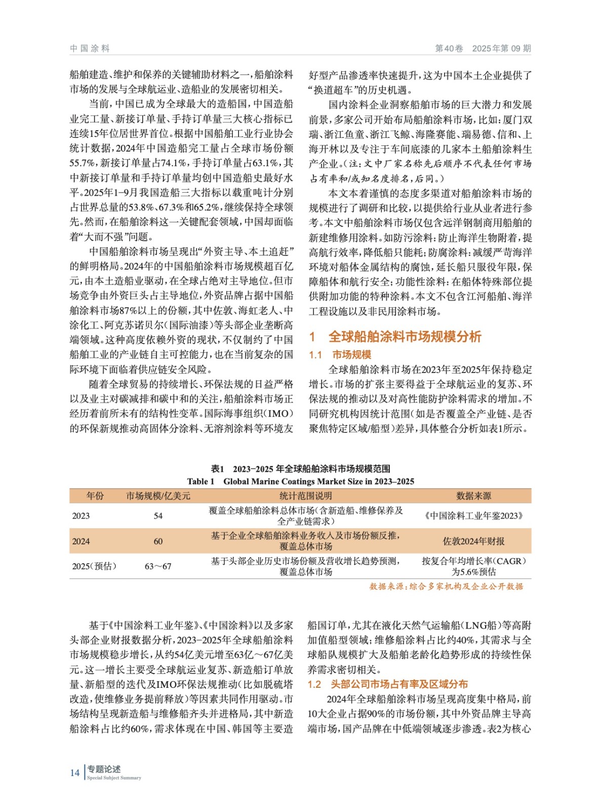 摘要:系統研究了2023?2025年全球與中國船舶涂料市場行業規模,解析了以中日韓為核心的亞太市場及中國“外資主導、本土追趕”的競爭格局,并深入闡述了防污涂料向環境友好、長效與智能化演進的技術動態。分析表明,外資企業的綜合優勢構筑了高端市場壁壘,而本土企業的根本性困境在于部分核心技術缺失、國際認證不足與高端應用相對匱乏。因此,未來破局的關鍵在于:需精準把握環保法規與國產替代窗口,通過攻克關鍵材料、突破認證與高端應用壁壘,實現從規模擴張到技術引領的根本性轉型,從而助力中國從造船大國向造船強國轉型。