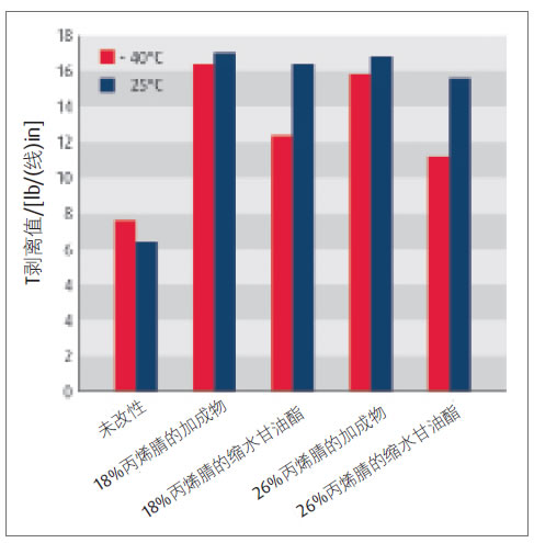 將該加成物配制成橡膠添加量為15份(份/100份樹脂)的單組分環(huán)氧膠黏劑,常溫貯存3個月后,根據(jù) ASTM-D1876,對其在電鍍鋅鋼上進(jìn)行T剝離強(qiáng)度試驗(yàn)。試驗(yàn)結(jié)果如圖7所示。與傳統(tǒng)的26%丙烯腈端羧基丁腈橡膠環(huán)氧加成物相比,在環(huán)氧加成物中加入CTB,在電鍍鋅鋼上的T剝離強(qiáng)度增加300%以上。這是低溫環(huán)境下膠黏劑增加韌性的一大進(jìn)步。