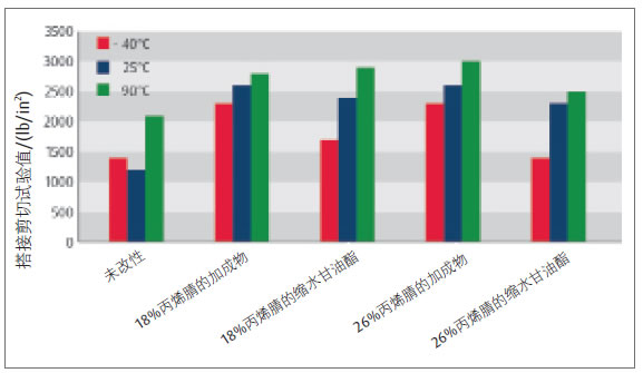 圖5和圖6表明,室溫(25 ℃)下T剝離結(jié)果和搭接剪切結(jié)果,均較低溫環(huán)境(-40 ℃)下的性能提高更大。膠黏劑在汽車和航空等工業(yè)領(lǐng)域使用時,要求在-40 ℃的氣溫下能保持良好的性能,這可以通過在環(huán)氧配方中加入較低玻璃化溫度的活性液態(tài)聚合物(TgRLP)來實(shí)現(xiàn)。