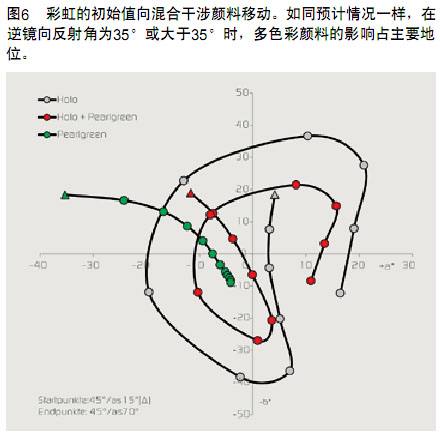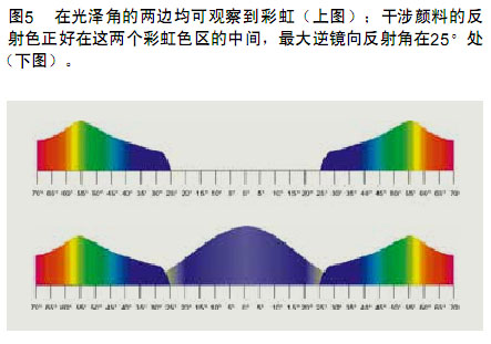 > 從上述多色彩顏料的噴漆圖可看出,在觀察角的任意一側都可檢測到兩道彩虹帶之間出現一個間隙。可加入干涉顏料填補這個間隙。此類混合物可用多種方式制成,干涉顏料的選定顏色也可能影響彩虹色(見圖5、圖6和圖7)。