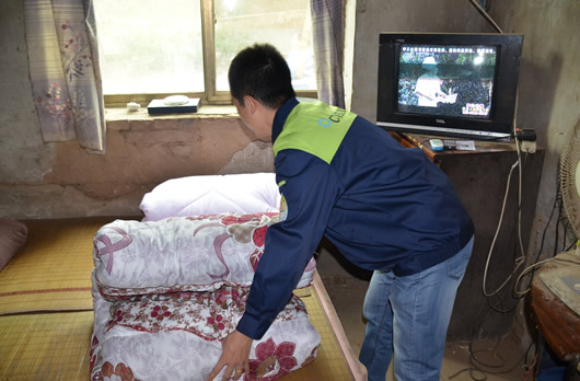 工作人員為幫扶戶更換新購置被褥