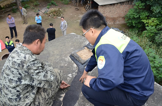 工作人員與扶貧戶溝通房屋修繕情況