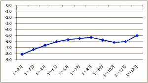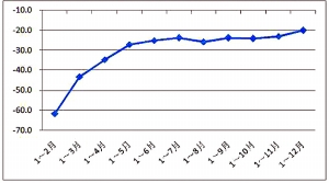 2015年石油和化工行業利潤月度累計變化情況 (單位:%)