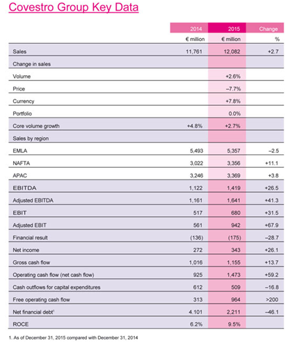下圖是關(guān)于科思創(chuàng)公司2015財(cái)年報(bào)告的關(guān)鍵數(shù)據(jù):