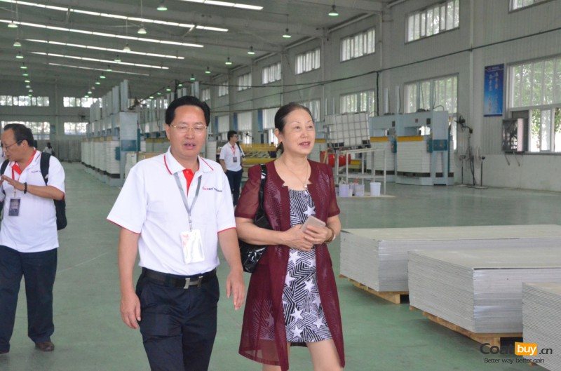 嘉賓們抵達固克(天津)公司后,首先參觀了整個生產基地。目前,天津基地是國內最大的保溫一體板生產企業,建有天工石生產車間、保溫材料車間、涂料車間、研發中心、實驗室等系列配套設施。