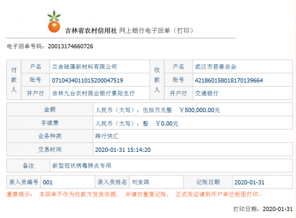 1月31日,蘭舍硅藻新材料有限公司向武漢市慈善總會(huì)捐款人民幣50萬(wàn)元,作為疫情救助專款使用,支援武漢抗擊疫情,同舟共濟(jì),共度難關(guān)。
