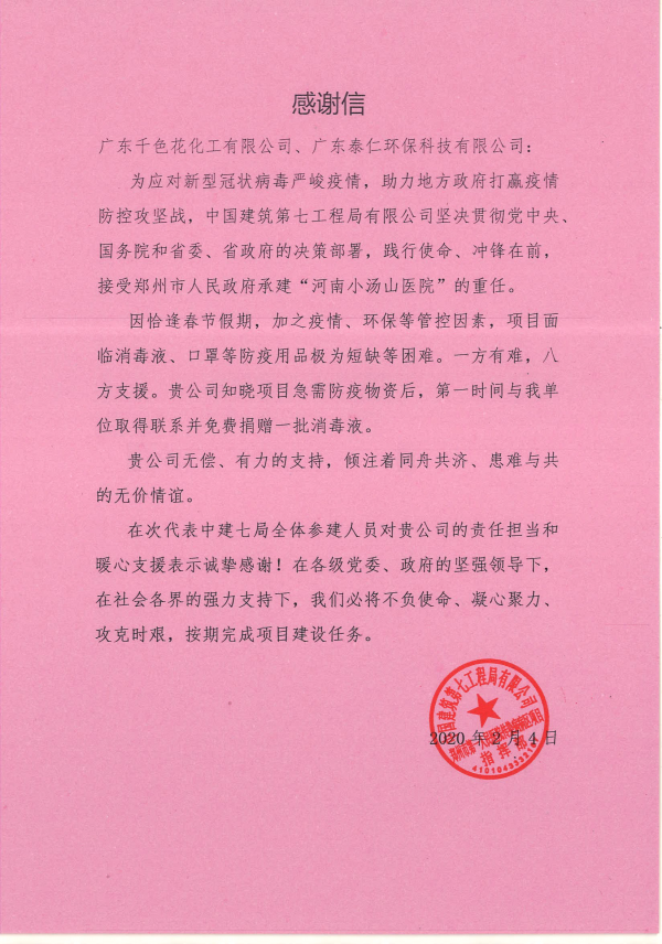 因恰逢春節(jié)假期,加之疫情、環(huán)保等管控因素,項(xiàng)目面臨消毒液、口罩等防疫用品極為短缺等困難。一方有難,八方支援。廣東千色花化工有限公司、廣東泰仁環(huán)保科技有限公司知曉項(xiàng)目急需防疫物資后,第一時(shí)間與承建單位取得聯(lián)系并免費(fèi)捐贈批消毒液。