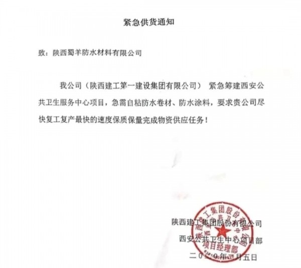 疫情面前,北新防水人一直奮戰(zhàn)在各地專業(yè)防疫醫(yī)院建設(shè)和發(fā)熱病房建設(shè)第一線。繼武漢火神山、鄭州小湯山等重大項(xiàng)目援建之后,2月6日,滿載北新蜀羊防水材料的貨車駛?cè)胛靼舶妗靶健贬t(yī)院工地。西安公共衛(wèi)生中心項(xiàng)目占地500畝,對(duì)標(biāo)4A標(biāo)準(zhǔn)建設(shè),1月31日晚上通知建設(shè)單位進(jìn)場(chǎng),北新建材將為西安版“小湯山”醫(yī)院提供北新防水材料和龍牌石膏板輕鋼龍骨墻體吊頂系統(tǒng)、涂料、粉料砂漿等全套優(yōu)質(zhì)環(huán)保新材料捐贈(zèng)援建,全力支持打贏這場(chǎng)防疫攻堅(jiān)戰(zhàn)。